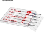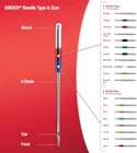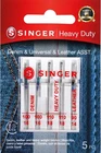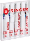 Singer 04801 Universal Heavy Duty Sewing Machine Needles, 5-Count Product Details Brand: SINGER Item Length: 4.52 Inches Compatible Devices: Domestic Sewing Machine Compatible Material: Leather Point Type: Regular Point Set of 5 heavy duty machine needles in assorted sizes Use for standard sewing projects on heavy fabrics such as denim, corduroy or leather Compatible with all quality sewing machines, including SINGER, Brother, and Kenmore brands (2) size 100/16 for medium weight denim, (2) size 110/18 for heavyweight cotton, and (1) size 90/14 for medium weight leather Machine needles come in slim and convenient case, marked with sizes on clear lid Use these SINGER heavy duty sewing machine needles when stitching heavy fabrics such as denim or leather. Assorted needle sizes allow you to choose the needle that best suits your fabric. The blue needles have a sharp point and slender eye for sewing jeans and other denim fabric. The brown needle, used with leather and vinyl, has a triangular point designed to make a clean hole in non-woven materials. Color-coded sizes of needles include: size 90/14 for use on leather, size 100/16 for use on denim, and size 110/18 for heavyweight woven fabrics. Needles come in a carrying case with sizes marked over needle slots, and can be used on SINGER, Brother, Kenmore and other quality sewing machines.