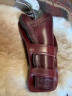 This single action revolver holster by Wylie Leather is the perfect addition to any cowboy or Western enthusiast's collection. Designed for Colt SAA models and the Ruger Vaquero, this holster fits up to a 5 1/2" barrel and features a 3 o'clock carry position with a neutral cant. The holster is made of high-quality mahagony dyed and finished Hermann Oak American leather and is suitable for right-handed individuals. The holster comes in a classic belt (OWB) style and is perfect for hunting or any other outdoor activity. It is manufactured in the United States and is a must-have for any gun owner. Don't miss out on this opportunity to add a Cheyenne Loop Western holster to your collection! Actual holster is shown.