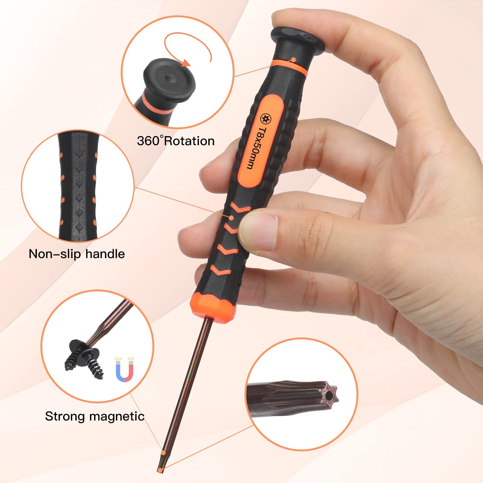 The screwdriver set is a really good helper for life and work. 【Applications】 -- The kit includes a torx T8 security screwdriver and a double-end crowbar. The torx T8 screwdriver can be used for PS3, PS4, PS5 consoles and controllers, Xbox one,Xbox 360 controllers, macbooks, laptops and other devices. The double-end crowbar is used for opening the screen and back cover of electronic devices. 【Magnetic S2 steel screw head】-- All our screwdrivers are magnetically designed, which can fix small screws to avoid falling. screwdrivers are made of high-quality S2 steel, after heat treatment, it is more accurate and durable than silver CRV bits. 【Slip-resistant rotatable handle】-- The screwdriver handle is made of TPR and PP materials, with a special non-slip design, offering a sense of comfortable. The top of the handle is 360°rotatable design which makes it more convenient to remove the screws. 【Portablity】-- The screwdriver and a double-end crowbar are placed in the small package bag, which is convenient for carrying and store. It is also convenient for you to take out the screwdriver for maintenance. 【Attention】--The kit is user-friendly, please make sure what kind of screwdriver you need.