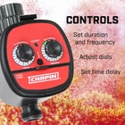 OUTDOOR USE: fits faucets with a ¾” GHT thread then connect your garden hose; use with inline sprinkler systems, standard sprinklers and other irrigation equipment SET AND SCHEDULE: duration, frequency, time delay allow you to decide how often and how little you want to water; set it to delay watering until a specified time; water at a specific time during the week or on multiple days; set the duration for how long it will run DURATION: 1, 3, 5, 10, 15, 20, 30, 60, 90, 120 minutes; ideal if there’s a drought and you need to limit water or watering specific plants and areas you don’t want to overwater FREQUENCY: 1, 2, 3, 4, 6, 8, 12 hours and 1, 2, 3, 7 days; ideal if you have a set schedule, know it’s going to be hot and dry or prefer to set it and forget it TIME DELAY: options to set desired watering time; ideal if you’d like to at specific times of the day or when you know you’ll have rain and additional watering isn’t needed CONSTRUCTION AND INSTALL: heavy-duty plastic and water-resistant, cover included; install above ground, vertically at the tap and it can handle an operating pressure up to 116 psi ACCESSORIES: backflow valves sold separately, 2 AAA batteries required (not included) Spending way more time watering your lawn than enjoying it? Over watering a concern and your garden can’t recover? Worried about conserving water while giving your lawn the care it needs when watering is restricted? Save time, enjoy your yard more and conserve water. Chapin makes it easy and affordable to add a water timer to your home garden system. Water timers regulate the amount of water consumed and can comply with municipal watering restrictions. Our 41001 programmable, motor driven water timer connects to any outdoor faucet with a ¾” GHT thread. Install it outside to control sprinklers or irrigation systems in your garden and yard. Simple, two dial display with dust cover. Always use clean freshwater with this unit between 34° and 140° F (1° C to 60° C).