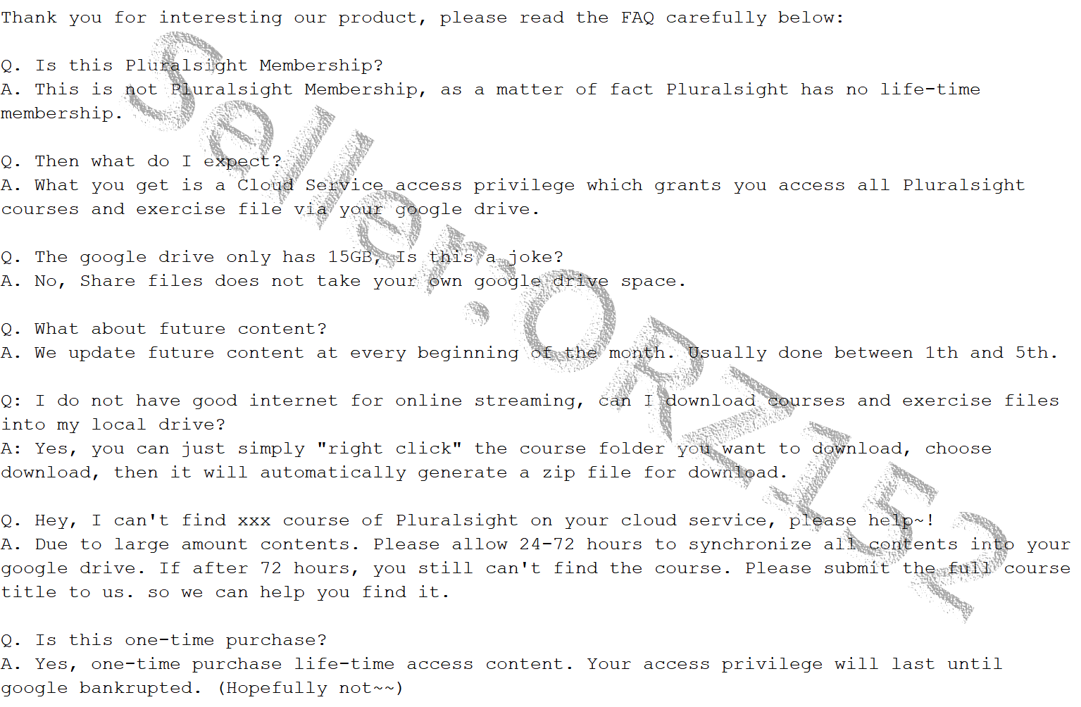 Important! Due to excessive demand and low capacity of sharing invitation s , we have changed the pluralsight price We currently only have less than 40 life-time access invitations left for pluralsight. Sitepoint & Pluralsight Training Package Please read the item description below before you buy: 1. This is not Sitepoint Membership. But full courses of sitepoint contents access privilege that includes Premium video tutorial and Premium Library Book. 2. What you get is a Cloud Service Access Privilege that can access all courses of Sitepoint for life-time. 3. We do update monthly for future contents. 4. You need a gmail account (free signup) in order to access the Cloud Service.(We will send you invitation via gmail) 5. Its one-time purchase, you will never need to renew at all. 6. You can download all the contents (Videos, toolkits or exercise files) if its necessary. 7. We also offer PIuraIsight full site course life-time Access.(Please check the "Training Package" Drop down menu). The method is the same above. If you are interested PIuraIsight full site course life-time Access, please click and read F.A.Q below PluraIsight Full Site Course Life Time F.A.Q MS Office 2019 Professional Plus F. A.Q F. A. Q Q: Minimum System Requirement? A: Microsoft account Internet access Windows 10 1.6 GHz, 2-core processor 4 GB, 2 GB (32bit) RAM 4 GB available disk space 1280× 768 screen resolution Q: How fast you can deliver the item? A: For Retail package we will send on next day, buyer should receive it within 2-5 days depends on buyer's location. Q: Why Medialess Delivery is cheaper? Any difference compare to Retail Package? A: Physical Package always cost more than Digital product. Only difference is the Retail Package will come with COA, but Medialess Delivery does not. Both products bind with Microsoft Account which mean a permanent activation as long as you keep your MS account secure. Q: My internet is slow, I am not able to complete installation online, please help~! A: No worries, we will send you a backup DVD by request. The backup DVD will contain full version of office. However you still need product key for activation purpose. Q: Windows 10 only? A: Yes, according to Microsoft, this product only compatible with Windows 10 32bits or 64bits. If you run any Windows OS other than Windows 10, please upgrade your windows to Windows 10 Q: Return Policy? A: You can not return the item if you activate the product for obvious reason. We have special software that can check if you have used the key or not. We do not accept the return if you have activate the product. We video recorded every step of shipping handing, also fully tested and video the product code authenticity. If you have used the product code to activate the software then return the item for refund, we will send our video record and proof of usage of the product code to ebay anti scam department. Once they have confirmed you have used the product code and return the item for refund, they will ban you indefinitely.