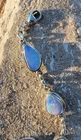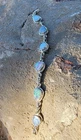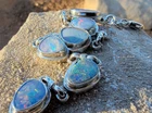 This bracelet features six assymetrical Australian Opal Doublets set in .925 solid Sterling Silver bezels. Each asymmetrical, natural doublet opals showcases a multicolor display, creating a unique and eye-catching piece. The bracelet is adjustable and has a secure lobster closure measuring a length of 7.5 inches. Details/ Dimentions: Six (6) total doublet assymetrical shaped Australian opals, Bezel setting (approx 1/4 5k 1/3 in diam, 4 mm thickness .925 Sterling Silver (unmarked) Links between opals measure 9.5 mm x 5mm x 1.25 mm Every link in the chain is silver soldered (securely closed) Total weight 18.9 grams Made in Australia (unmarked)