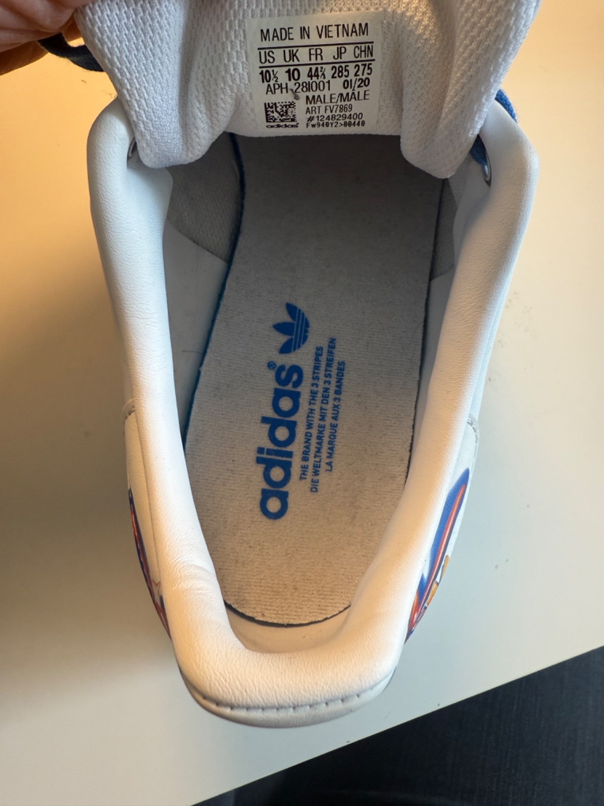 The product is a limited edition Adidas Stan Smith Graffiti sneaker in size 10.5. This particular model features a white color with bluebird accents, making it a unique and stylish choice for men. The athletic type sneaker belongs to the Adidas Stan Smith product line, showcasing the signature style and comfort associated with the brand. Perfect for those who appreciate both fashion and function in their footwear choice.