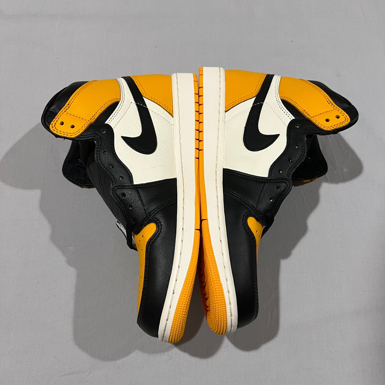 The Air Jordan 1 in purple and yellow is a high top sneaker with a style code of 555088-711. Manufactured with Taxi/Black/Sail colorway, this athletic shoe is part of the Air Jordan product line for men. Featuring a distinctive Yellow Toe design, this model was released in 2022, making it a sought-after addition to sneaker enthusiasts' collections.