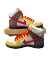 This is a pair of Nike Dunk SB high-top sneakers in size 10.5 for men. The shoes are part of the Color Skates x Dunk SB collaboration, featuring a brown suede upper with a colorful design. The model is called "Nike Dunk SB High Kebab and Destroy" and was released in 2021.
