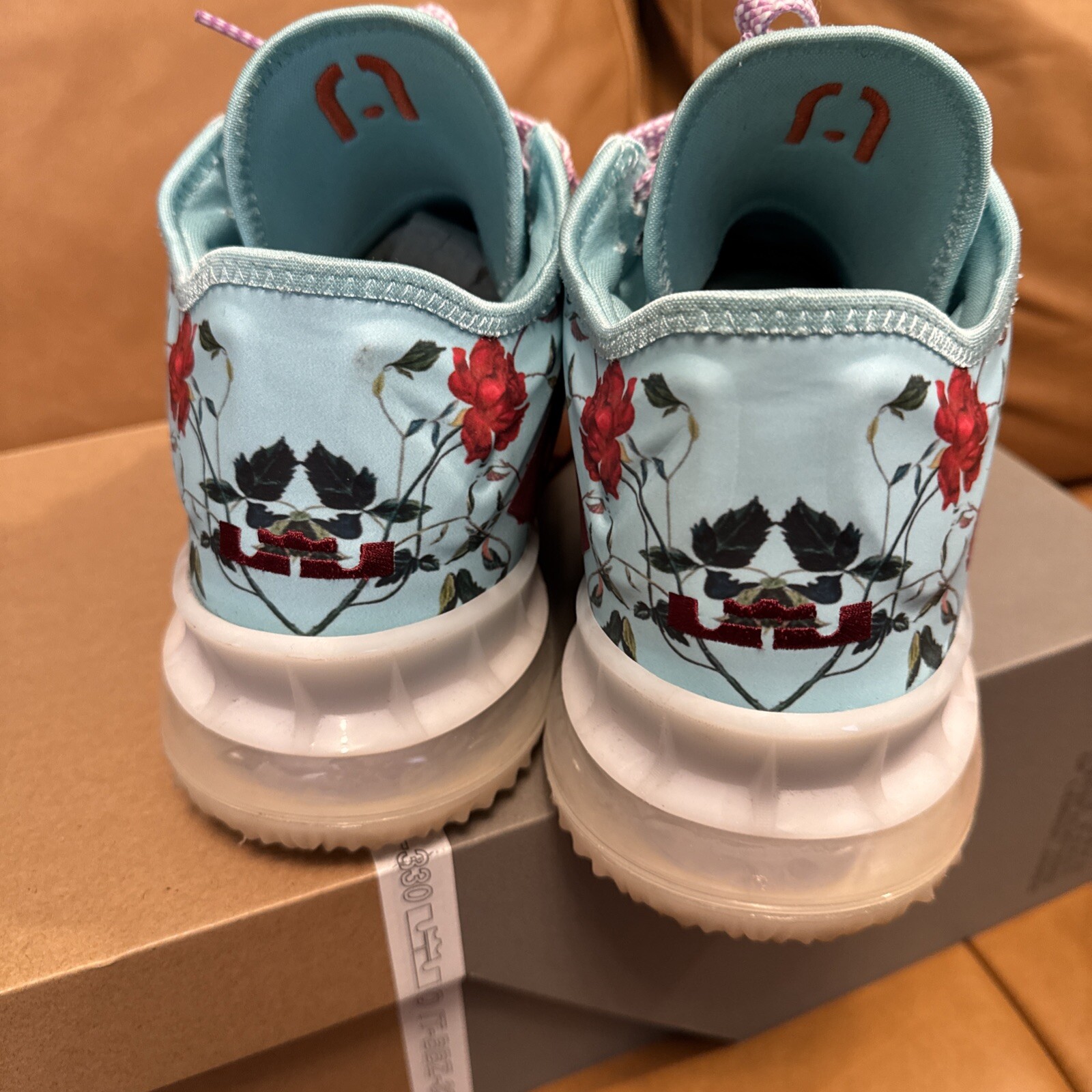 The Nike Mimi Plange x LeBron 18 Low Daughters is a blue sneaker style shoe for men. It features a low top shoe shaft style with a synthetic upper material and is part of the Nike LeBron product line. The shoe is in size 12 (UK 11.5) and has a style code of CV7562-400. Released in 2021, this athletic shoe is a collaboration between Nike and designer Mimi Plange. Used but like new. Slightly worn.