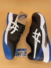 This is a pair of ASICS Gel Dedicate 8 men's running shoes in black with tuna blue accents. They are lace-up sneakers in size 13 (UK 12, EU 48) designed for activewear and casual occasions. The upper material is synthetic, suitable for summer, fall, and spring seasons. The style code is 1041A408-002, part of the ASICS Gel Dedicate product line.