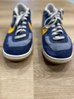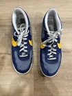 Introducing the Nike Sky Force 3/4 sneakers in a size 14. These shoes are perfect for any occasion, whether you're going for a walk, playing basketball, or just running errands. The shoes feature a low top shoe shaft style and a colorblock pattern in blue, with accents of gold and white. The shoes are made with synthetic upper material and foam insole material, providing cushioned and comfortable soles. They come with a standard shoe width and a rubber outsole material for added durability. These sneakers are part of the Nike Sky product line and are a perfect addition to any sports or casual shoe collection.