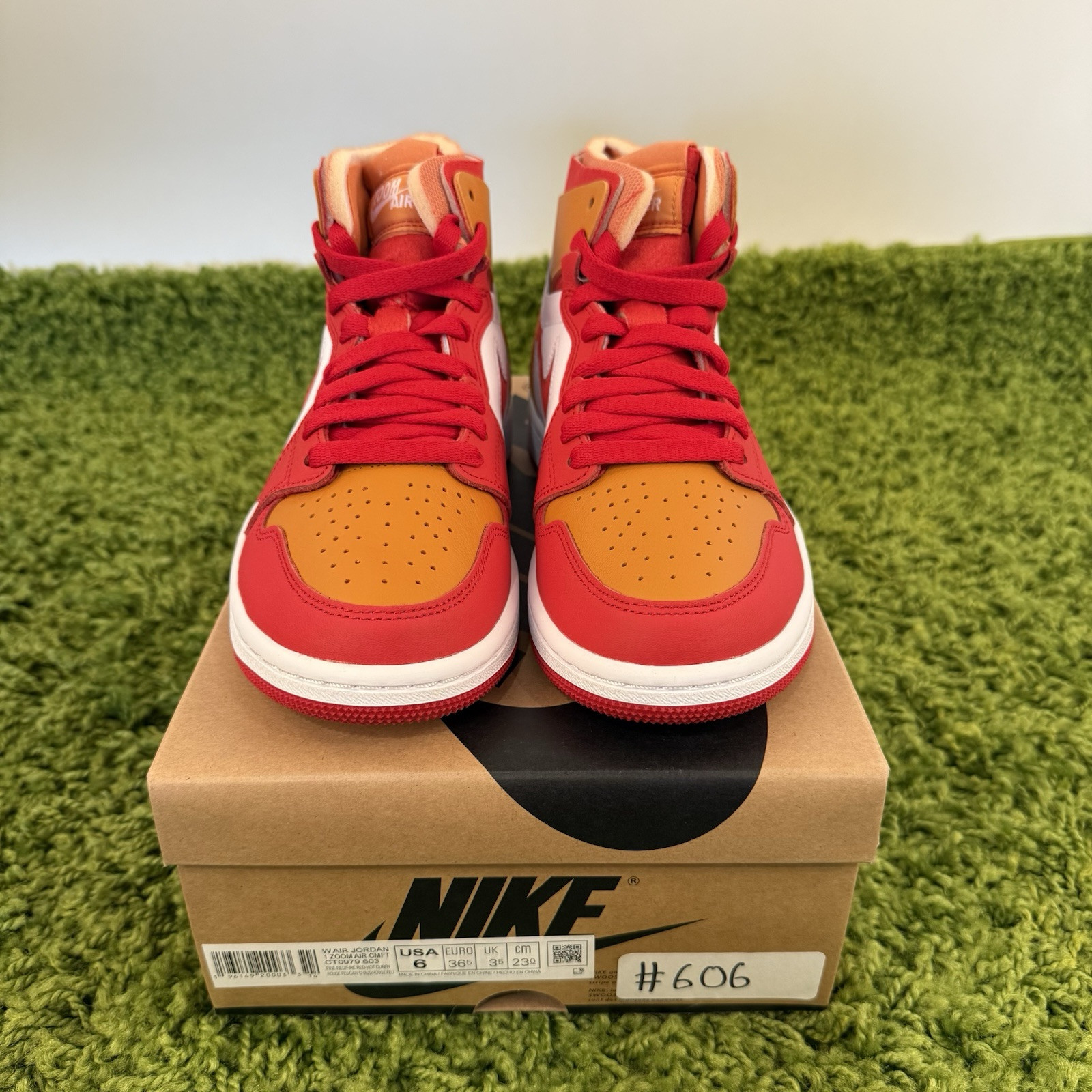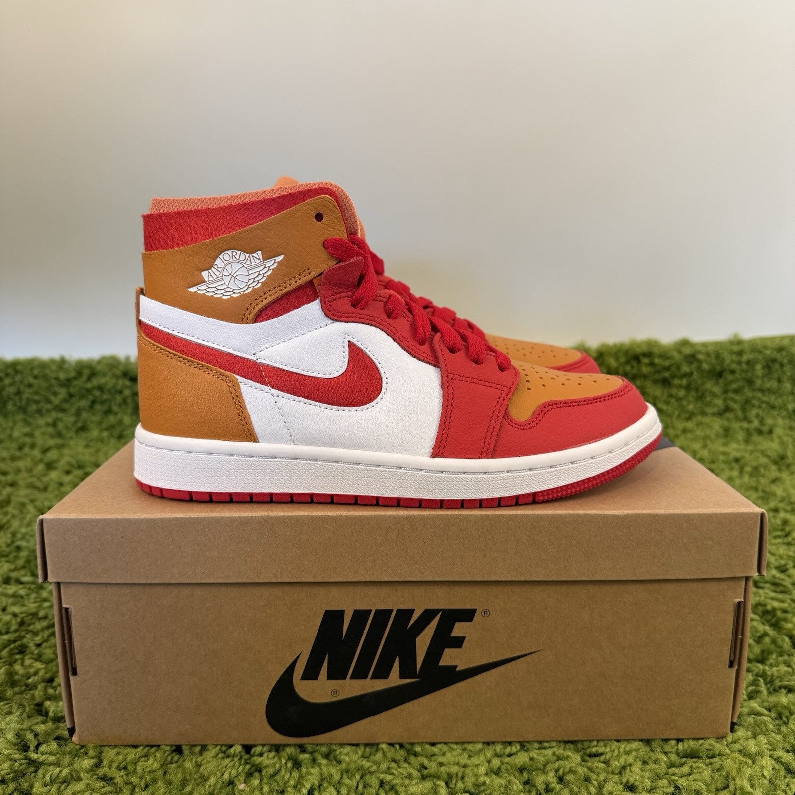 You a re b uy ing a pair of JORDAN 1 HIGH SHOES MODEL : JORDAN 1 HIGH ZOOM CMFT "RED CURRY" COLORWAY: Fire Red/Hot Curry/White SIZE: Womens US 6/Mens US 4.5 released in 2022 CT0979-603 CONDITION: BRAND NEW IN BOX INFO: The Jordan 1 High Zoom Air CMFT Fire Red Hot Curry (Women's), in women’s sizes, is a leather high top basketball shoe. In 1984, Nike developed the Air Jordan 1 for the Chicago Bulls' star player Michael Jordan. The Air Jordan 1 was released to the public the following year, and it has remained a beloved and frequently reinvented signature style ever since. Riffing on summer heat, Nike created a fiery red and orange color palette for the Zoom Air CMFT variation. At the Fire Red Hot Curry Jordan 1 High Zoom Air CMFT, the Nike Swoosh, tip, heel collar, and lace panel are done in Fire Red, accented by Hot Curry panels at the heel, collar, and vamp. White panels emphasize the midfoot and coordinate with Nike branding on the tongue and the Air Jordan wings logo at the ankle. A white midsole and Fire Red outsole complete the aesthetic.