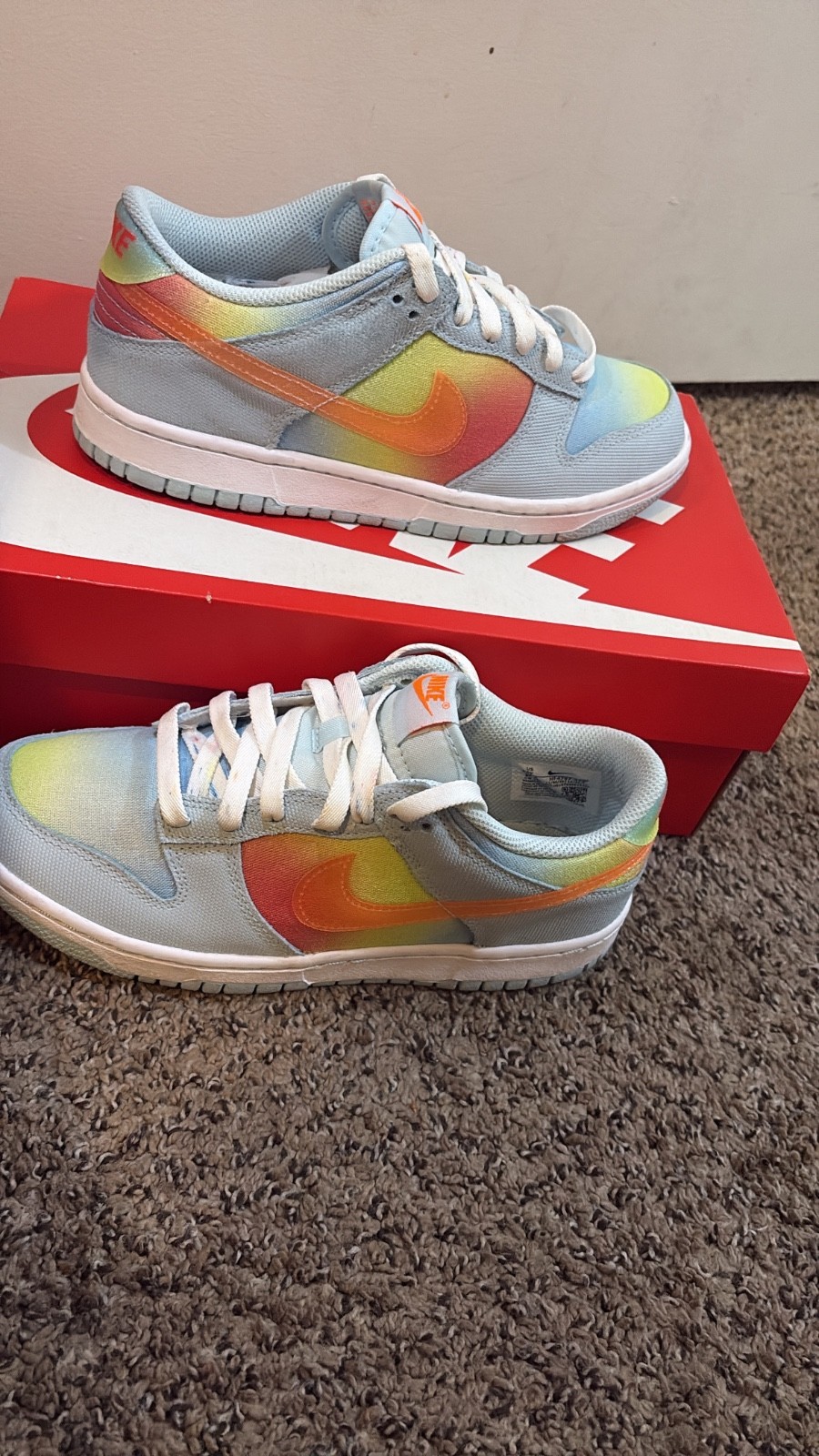 The product is a pair of Nike Dunk Low sneakers in a blue, yellow, and orange colorway, designed specifically for women in a UK shoe size 6.5. These low top athletic shoes are customizable and part of the Nike Dunk product line, known for their stylish sneaker design. The bold color scheme and brand name ensure a fashionable and trendy addition to any woman's wardrobe.