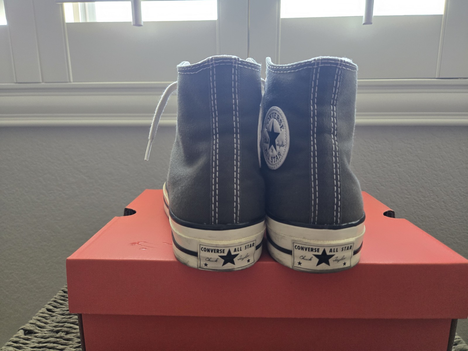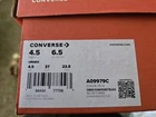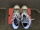 The product is a size 6.5 women's Converse Pre-owned item, see photos for details of slight scuffs. Chuck 70 Cargo Khaki shoe. It features a high top shaft style, lace-up closure, solid green color, canvas fabric type, rubber cleat type, and a standard shoe width. The sneakers are designed for casual occasions, walking performance, and are part of the Converse Chuck 70 product line. Made in Vietnam, these athletic shoes are suitable for summer, fall, and spring seasons.