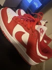 Elevate your sneaker game with these Nike Dunk Retro SP Low St. John's sneakers. The shoe features a low top design, making it perfect for everyday wear. It comes in a classic white and university red colorway, giving it a stylish and modern look. These sneakers are perfect for any athletic activity and are designed for men. The Nike Dunk is a popular choice for those who love comfort and style in their footwear. This product line is known for its quality and durability, making it a great investment for any sneakerhead. Don't miss out on the chance to own these amazing sneakers.
