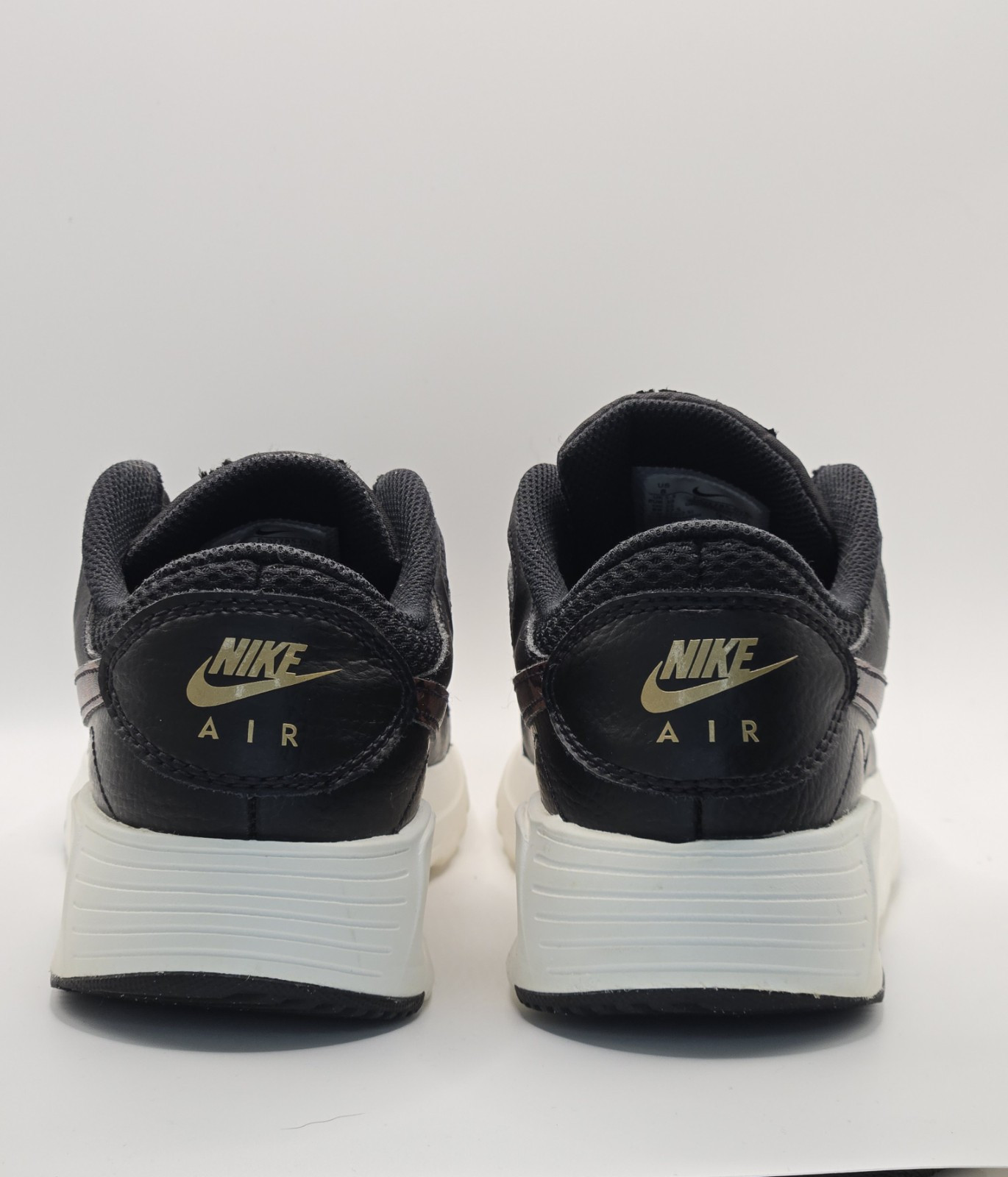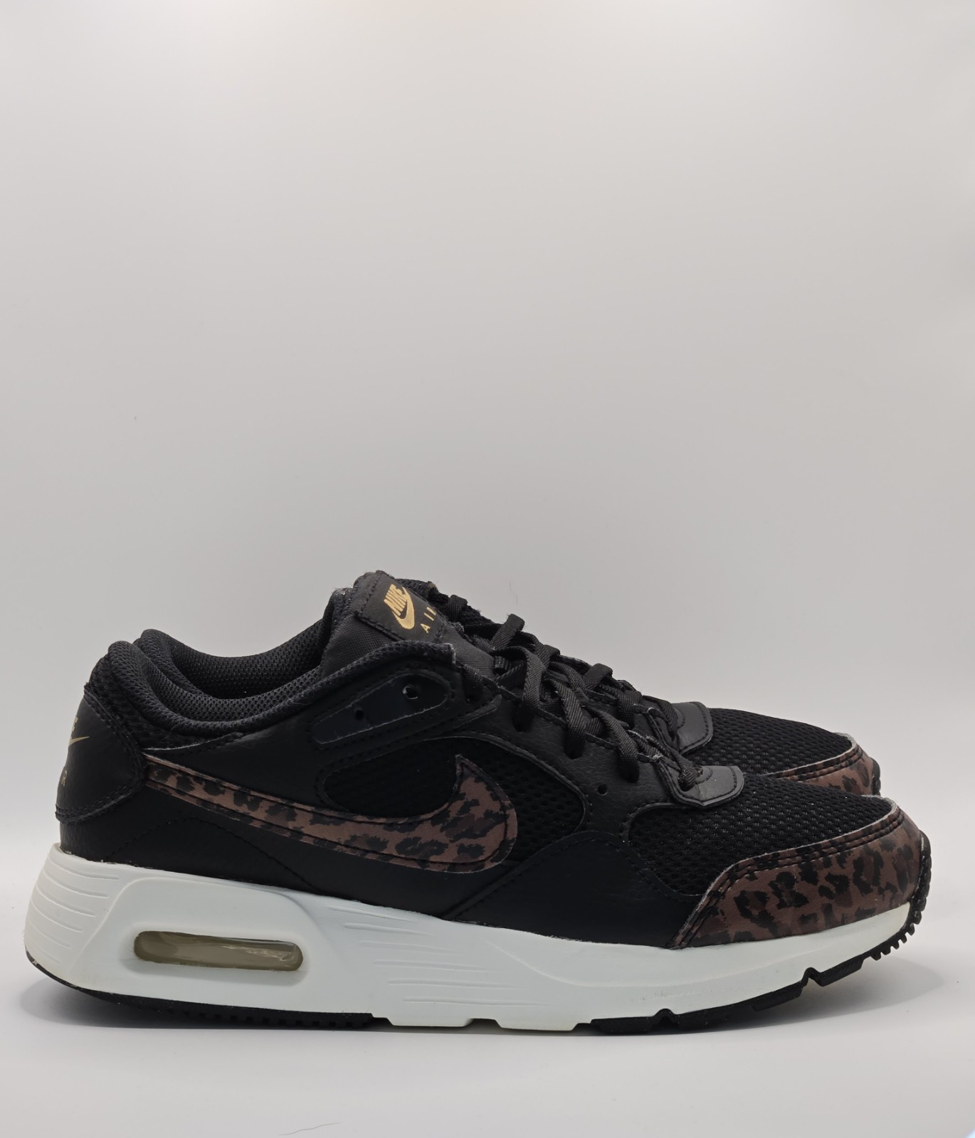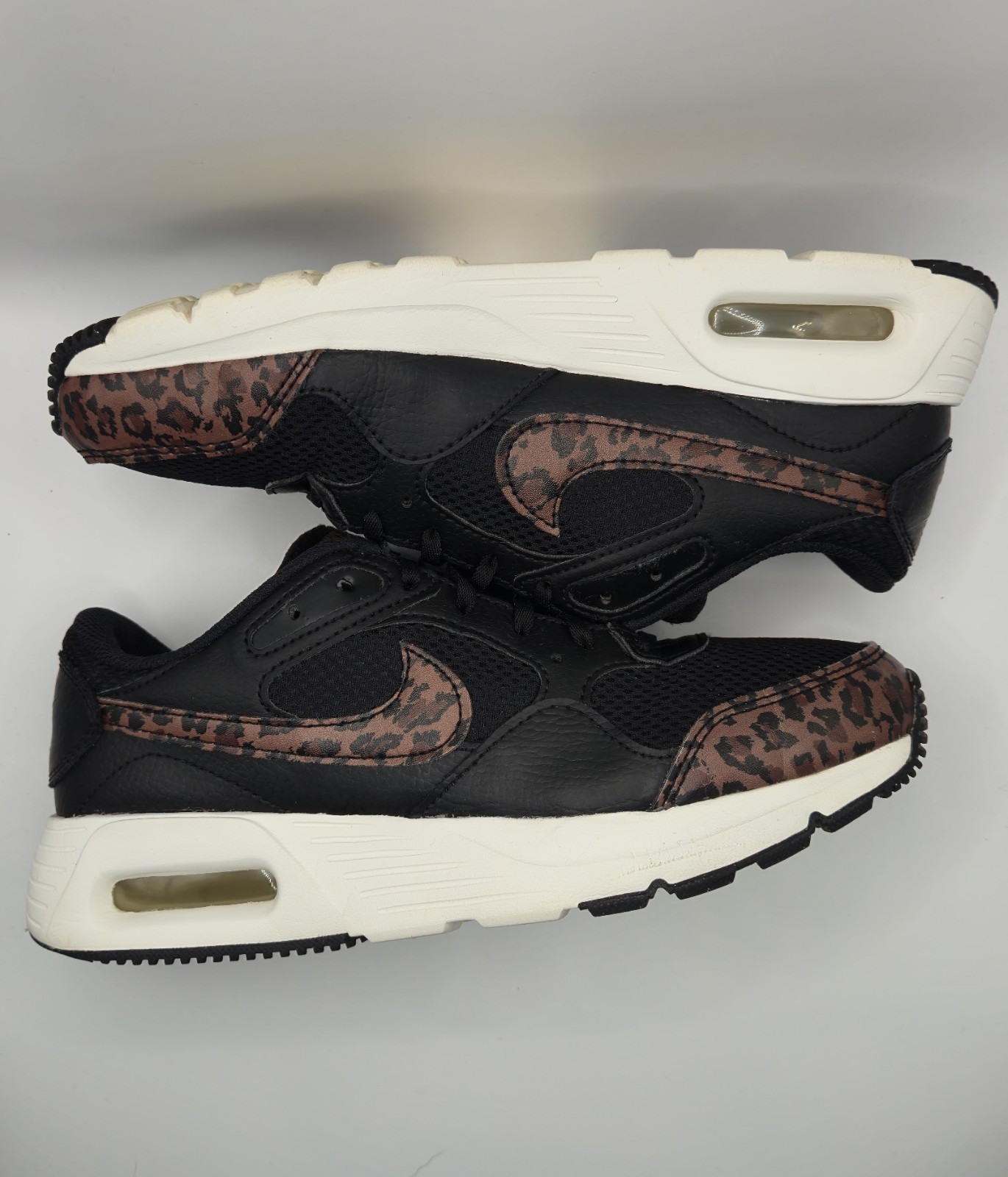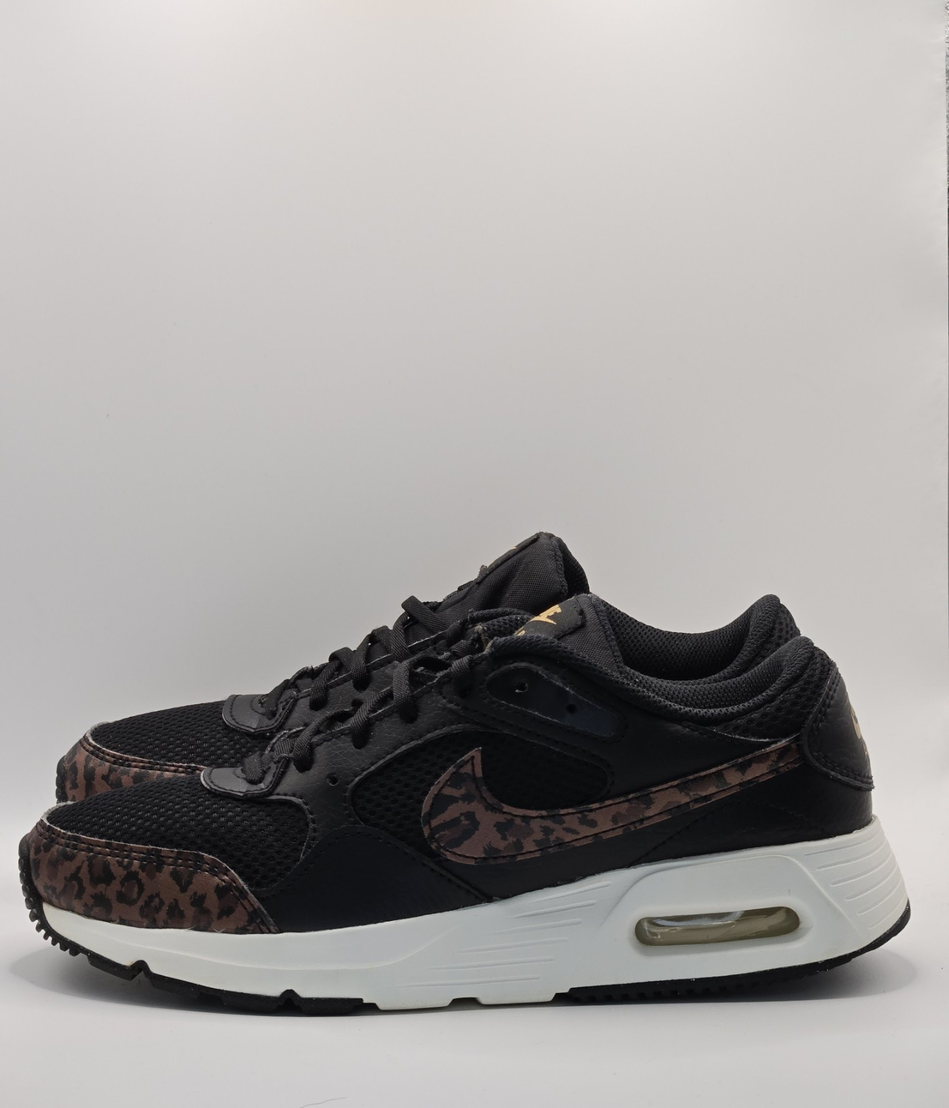 The Nike Women's Air Max SC 'Black Leopard' adds a dose of street-ready style to the retro-inspired lifestyle runner. The upper combines ventilated black mesh with tonal leather overlays at the forefoot and heel. Black and brown leopard spots enliven the leather Swoosh and forefoot overlay, while the heel patch displays standard Nike Air branding. The murky tones up top are countered by a crisp white foam midsole, fitted with a visible Max Air unit in the heel.