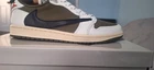 The product is a size 8 Travis Scott x Air Jordan 1 Retro OG SP Low in an olive green colorway. It features a low top silhouette with a suede upper material, providing a lightweight and comfortable fit. The design includes the iconic Jordan 1 silhouette, with a retro theme and Air Jordan product line branding. This sneaker is part of the 2024 release and is ideal for athletic use, making it a stylish choice for men's footwear collections.