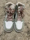 The product is a women's size 8.5 Air Jordan 1 Retro OG High Seafoam sneaker. This high-top shoe features a seafoam green colorway with a leather upper material, making it a stylish and comfortable athletic option for women. Part of the Air Jordan product line, this 2021 release offers a classic silhouette with modern design elements, perfect for sneaker enthusiasts looking for a fashionable and on-trend footwear choice. Visit my eBay store for more new and lightly used clothing, collectibles, and other items.