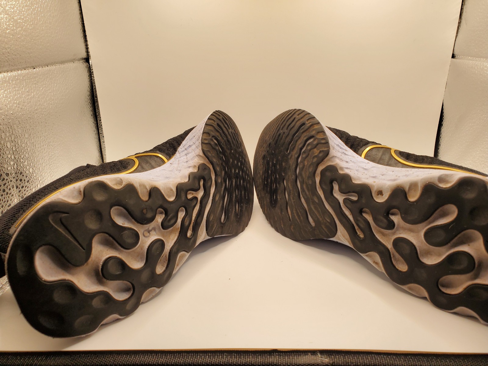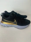 The Nike React Infinity Run Flyknit 2 in Black Metallic Gold is a stylish and comfortable sneaker designed for women who enjoy running and jogging. Featuring a lace-up closure, rubber outsole, and fabric lining, these shoes offer a great fit for size 8.5 feet. The solid black color with metallic gold accents and Nike logo give these sneakers a sleek and modern look, making them perfect for both activewear and casual occasions during the summer, fall, and spring seasons. Made with FlyKnit upper material and foam insole, these Nike React Infinity Run shoes are a practical and trendy choice for active women.