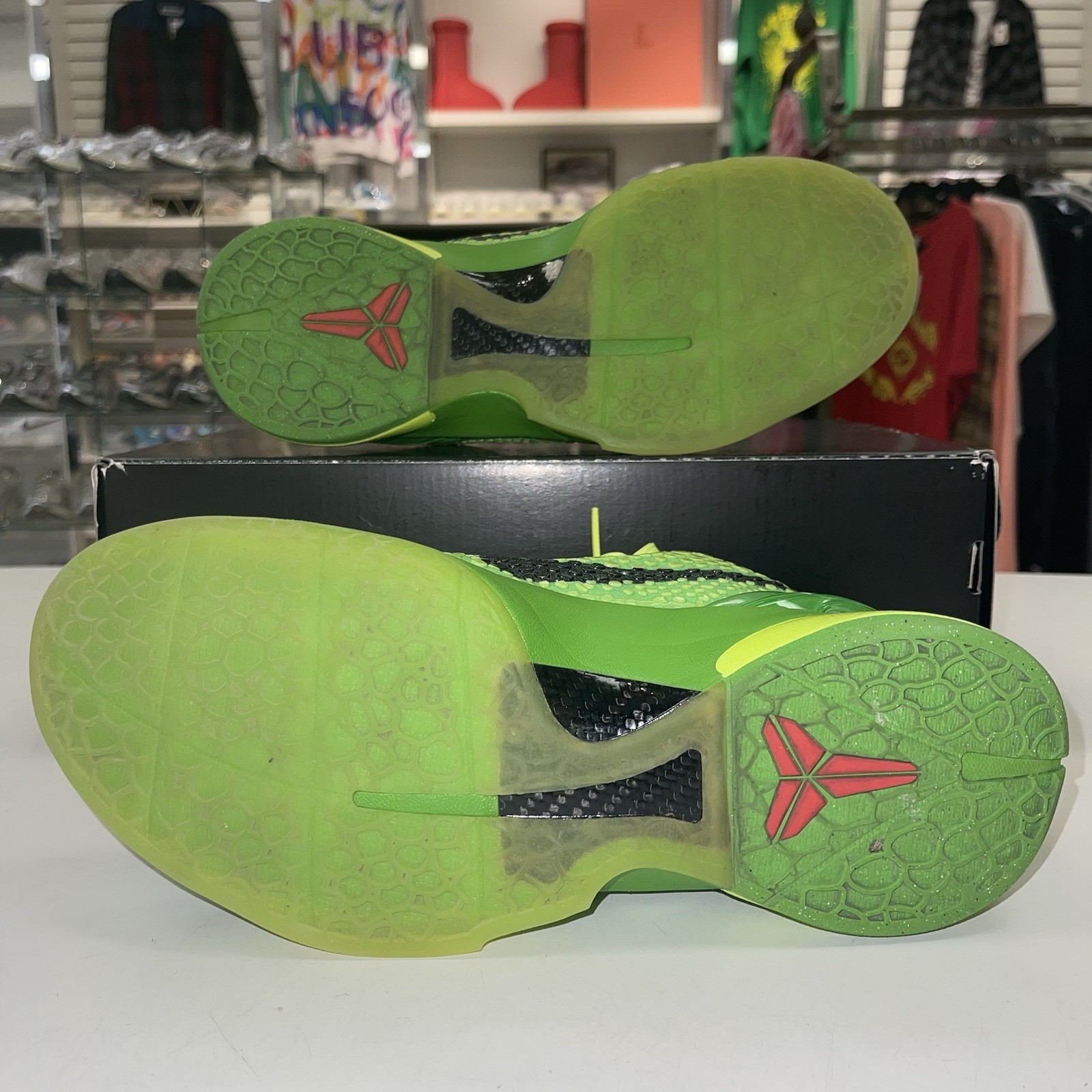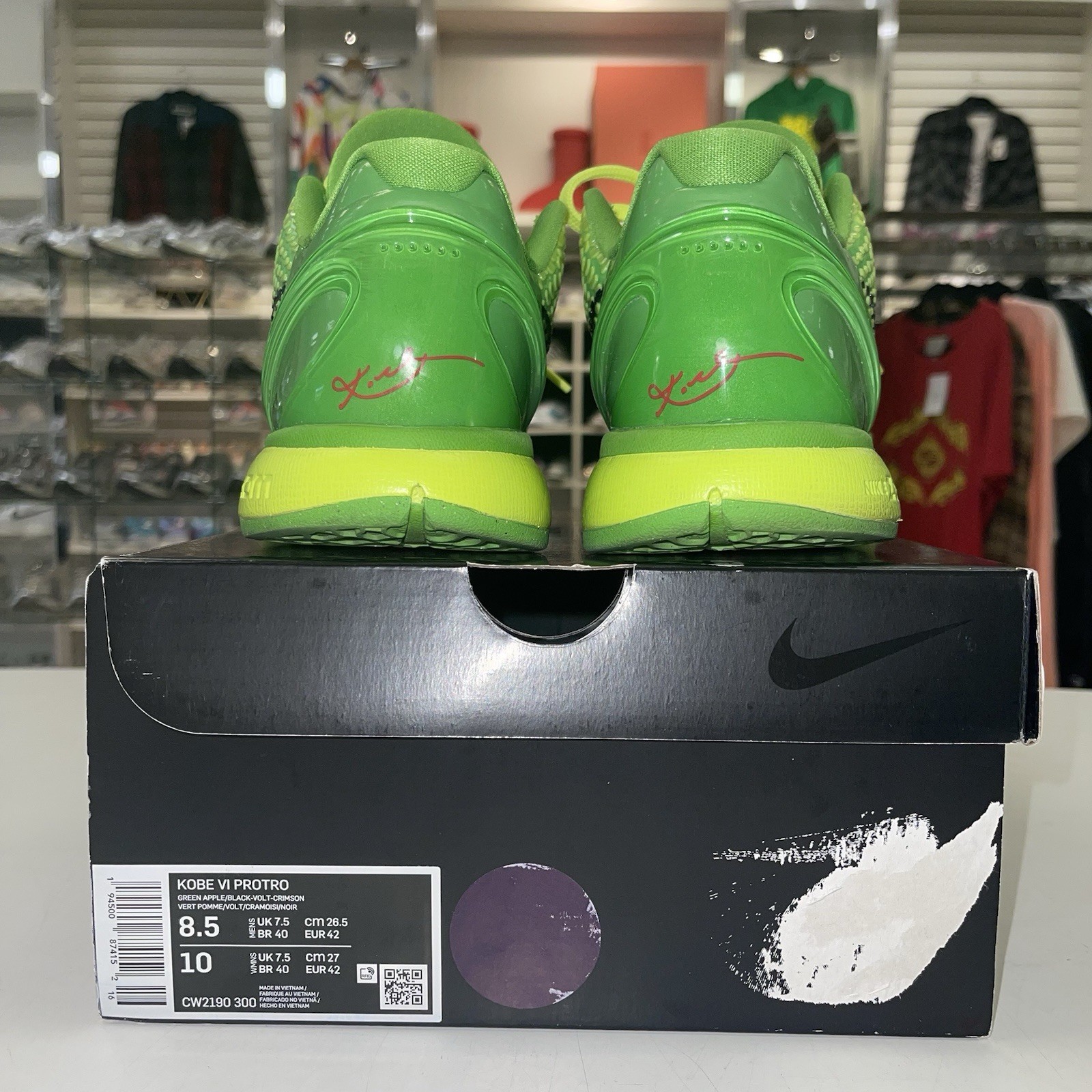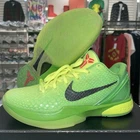 The product is a pair of Nike Zoom Kobe 6 Protro Low Grinch sneakers in size 8.5. These athletic shoes feature a low top shaft style and are designed specifically for basketball performance. The green colorway adds a unique touch to the classic Kobe model, making them a stylish choice for sneaker enthusiasts. Released in 2020, these Nike Zoom shoes are part of the Kobe product line and are sure to make a statement on the court.