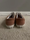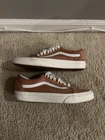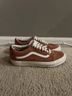This pre-owned VANS Old Skool sneaker in size 8.5 features a burnt brick suede upper with a low-top design and lace-up closure. It is a comfortable and breathable shoe suitable for various occasions such as activewear, casual wear, and workwear. The shoe is part of the VANS Old Skool product line and is characterized by its classic style and colorful burnt brick/true white color scheme. With a rubber outsole and cushioned insole, this sneaker is ideal for walking, school, and skateboarding activities.