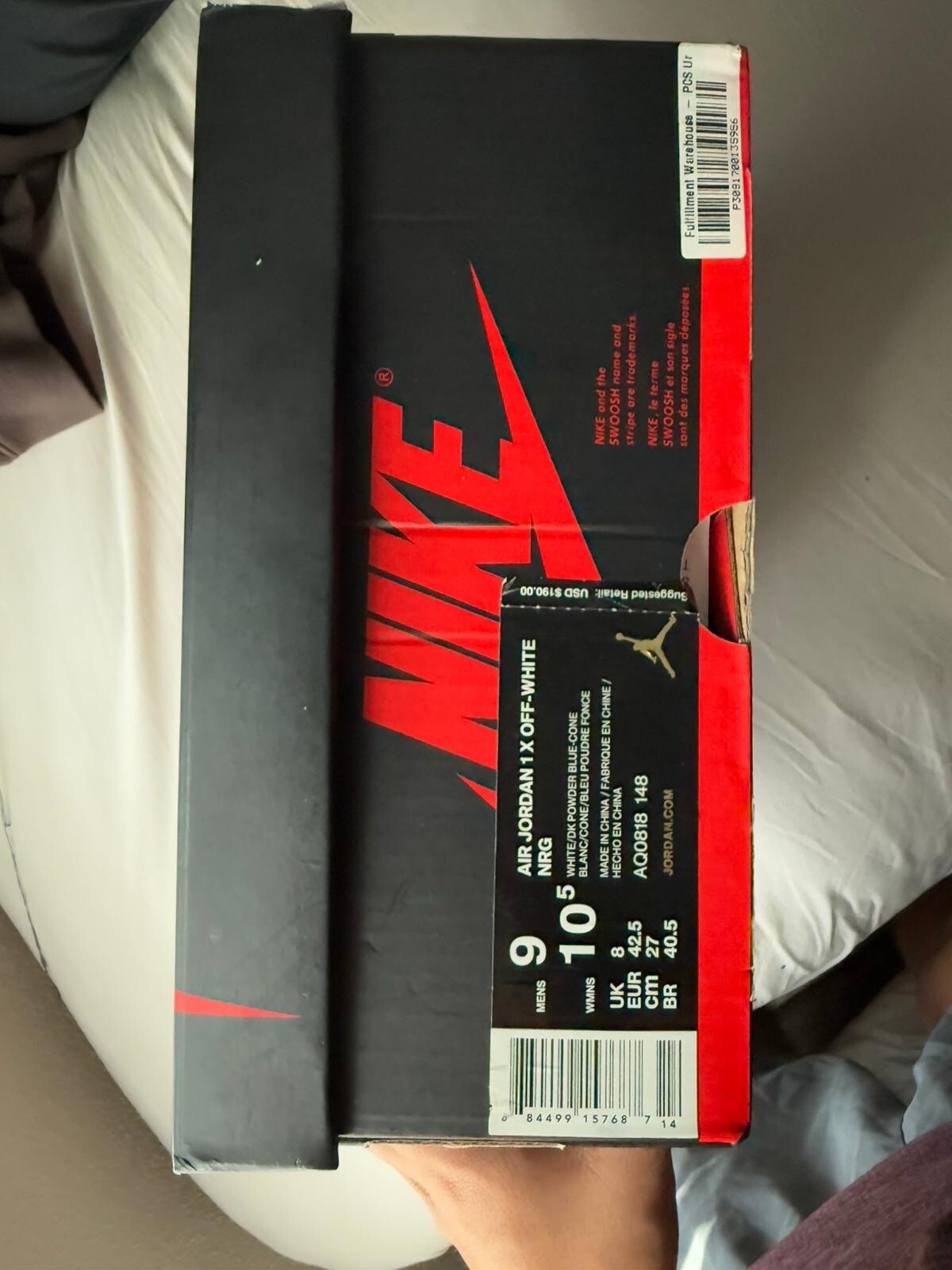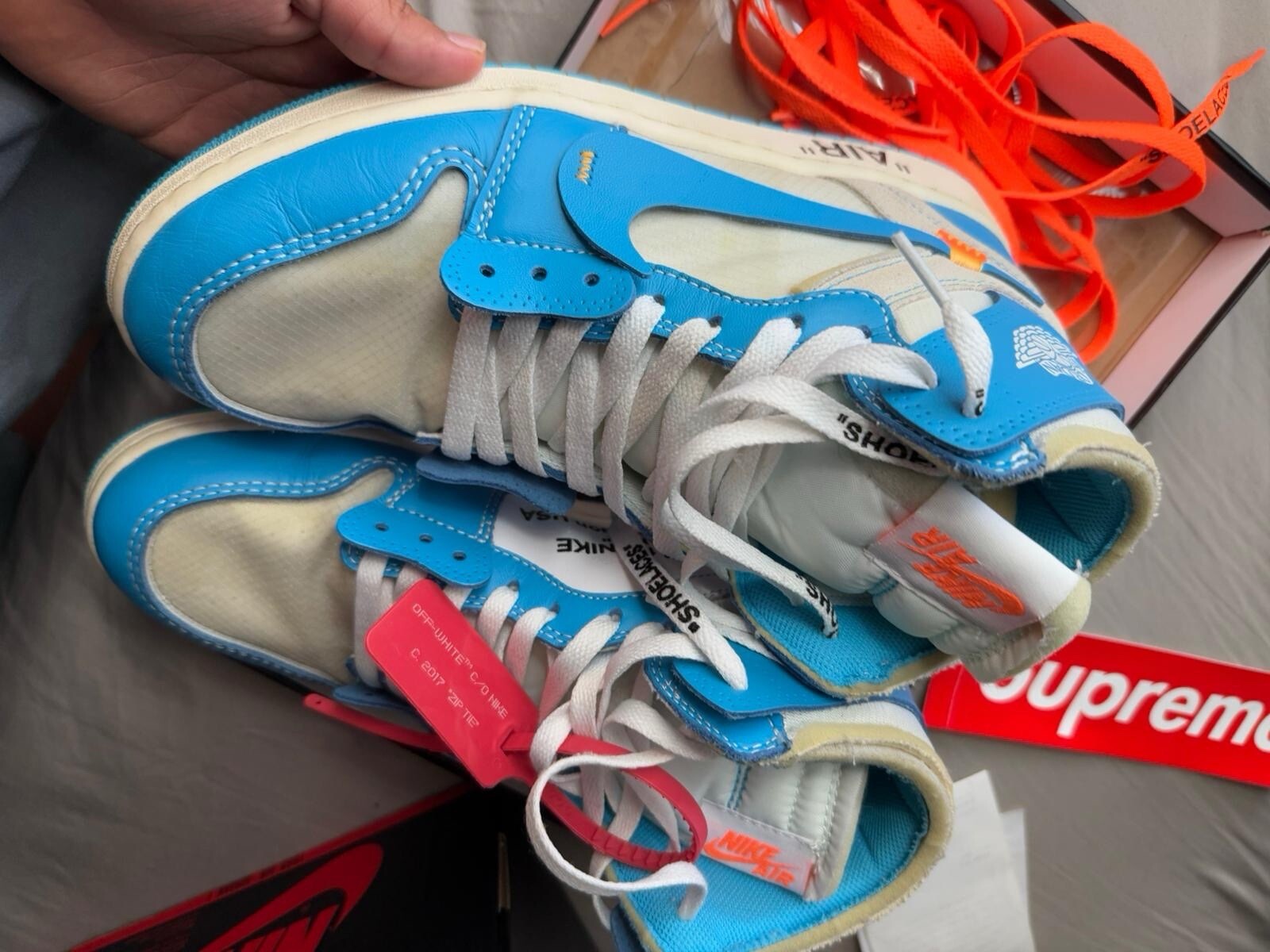Elevate your footwear collection with the Jordan 1 Retro OG x Off-White High in University Blue, a size 9 masterpiece that blends vintage appeal with modern flair. The iconic high top silhouette, complemented by the distinctive white, dark powder blue, and cone colorway, offers a versatile look that's as suitable for casual outings as it is for athletic endeavors. Crafted with premium leather uppers and designed with the signature comfort and durability that the Air Jordan product line is known for, these sneakers feature a style code AQ0818-148 and a release date of May 23, 2018. They're a stellar choice for anyone seeking a pair of sneakers that stand out with a classic touch and a contemporary edge.