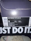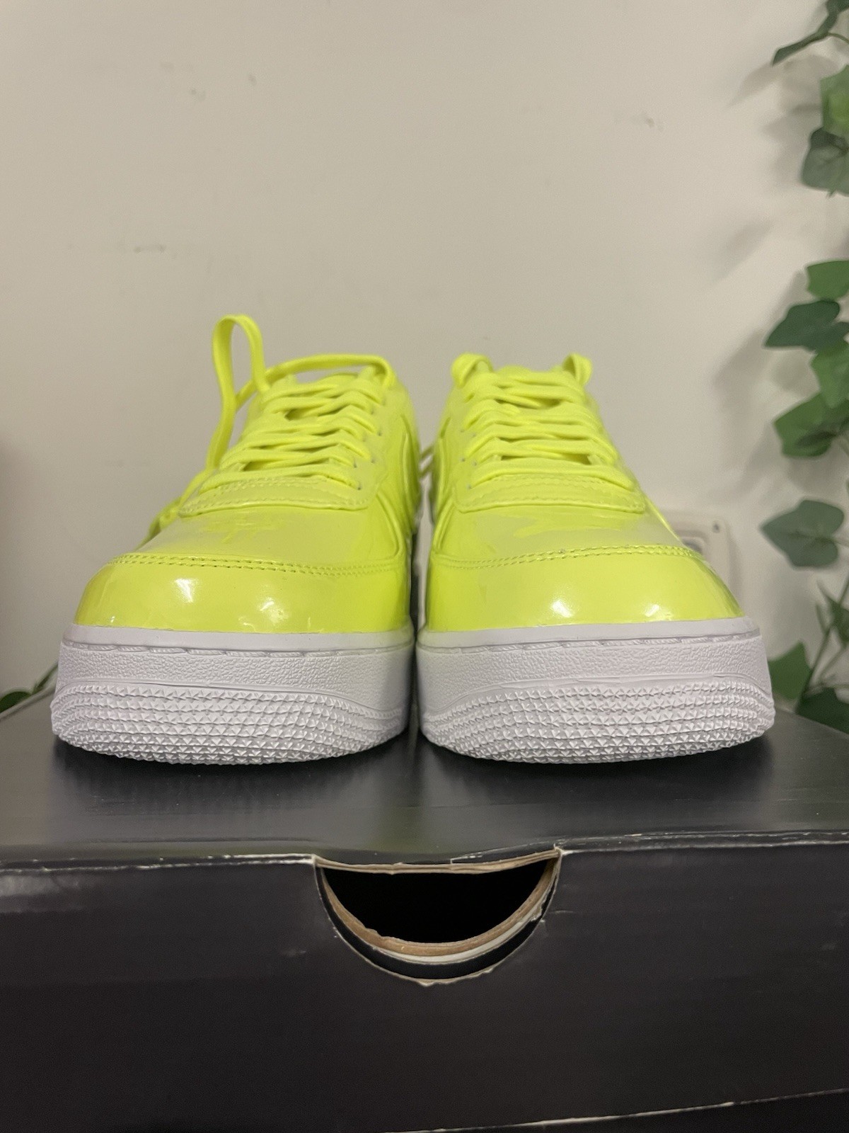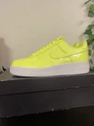 The product is a pair of Nike Air Force 1 '07 LV8 sneakers in a vibrant UV Volt Neon Green color, released in 2017. These low-top sneakers feature a patent leather upper, standard shoe width, and are part of the Nike Air Force product line. With a UK shoe size of 8 and US shoe size of 9, these sneakers are a rare find for collectors and enthusiasts of athletic footwear. Perfect for casual wear or activities like boxing, these sneakers combine style and functionality in a unique and eye-catching design. Small damage on box as seen in pictures.