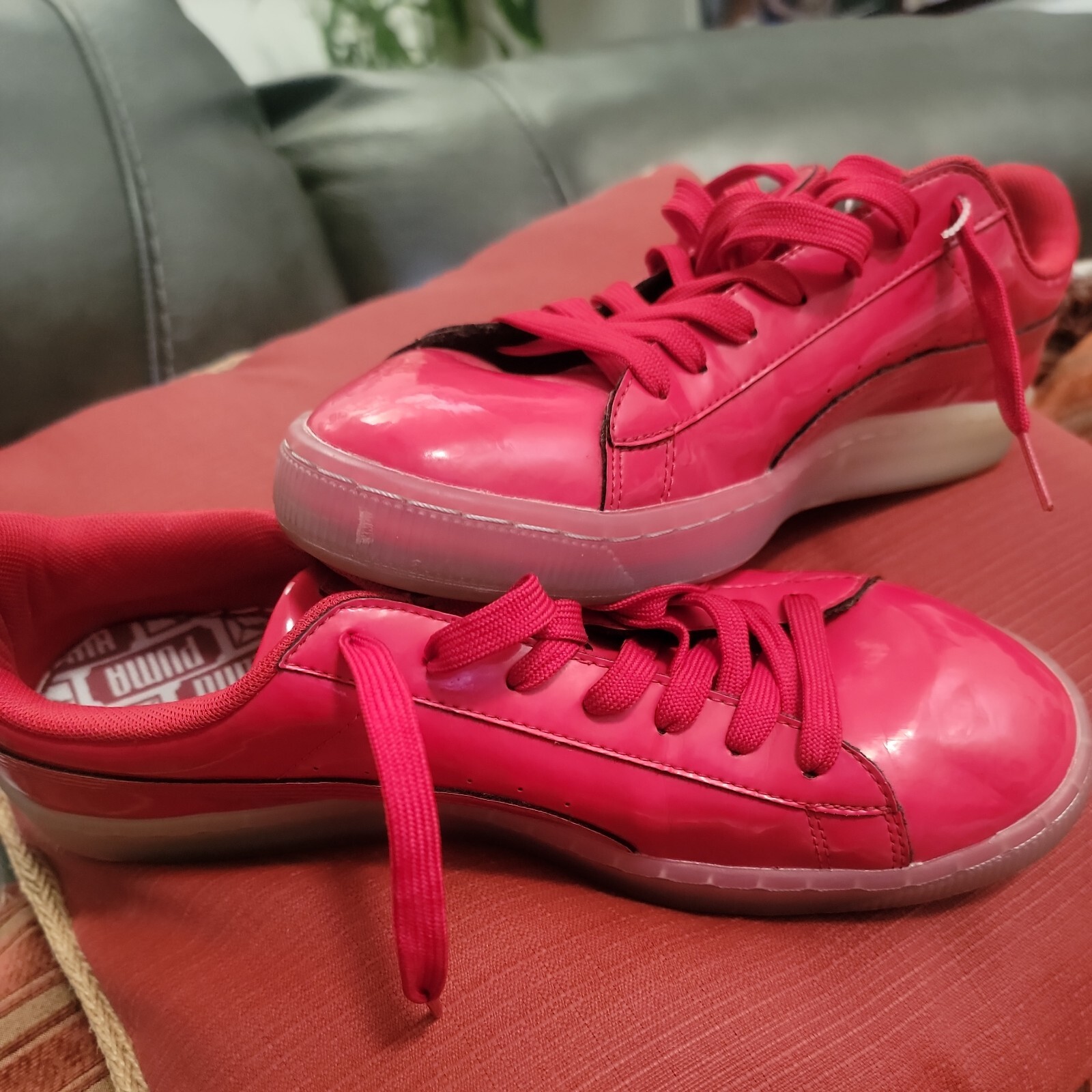 This is a pre-owned pair of PUMA Basket Classic Patent Emboss sneakers in size 9 for men. The shoes feature a red color with a clear side rubber detail in the style code 362035-01. They belong to the PUMA Basket product line and have a red blast manufacturer color. The design is a classic sneaker style with a red blast nickname.