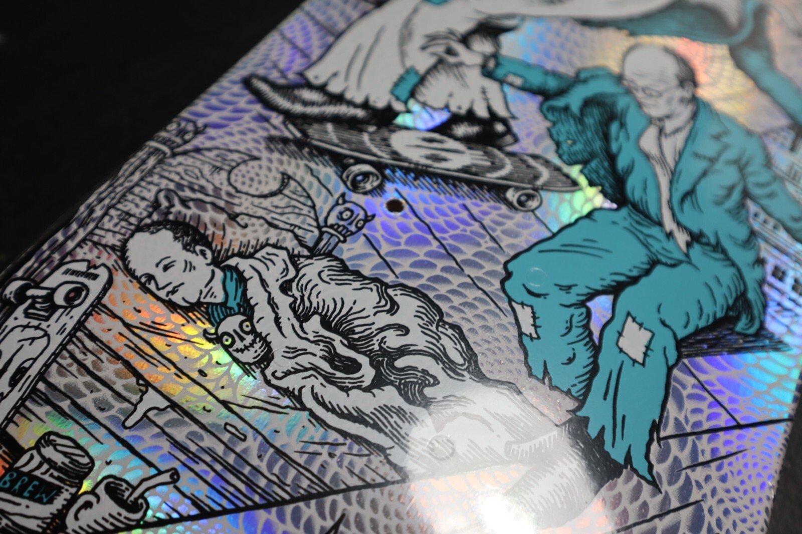 This shape is based off Ray's 80s pro freestyle model with a modified, less squarish tail. Molded with a short upturned nose and medium concave for added strength. The silk screened art features an updated spoof from his iconic 80s graphic from Santa Cruz Skateboards; Illustrated by Crab Scrambly. We're applying this wild composition onto a hologram background to match it's insanity. Singlekick with a mild upturned nose Medium concave for extra strength 7-ply Canadian Maple 7.25” x 27.25" Nose: 5.375" Tail: 5.625" Wheelbase: 12.202" Shipping is $19.99 within USA. Ships out same day as payment.