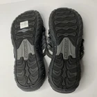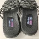 These Skechers 40873 Reggae Repetition sandals are black slip-on slides in women's size 8. They feature a low heel, cushioned insole, breathable fabric lining, and a rubber outsole. The design includes the Skechers logo and is perfect for casual comfort, outdoor activities, and travel. Made with leather uppers, they embody a nature and sports theme from the Skechers Outdoor Lifestyle product line.