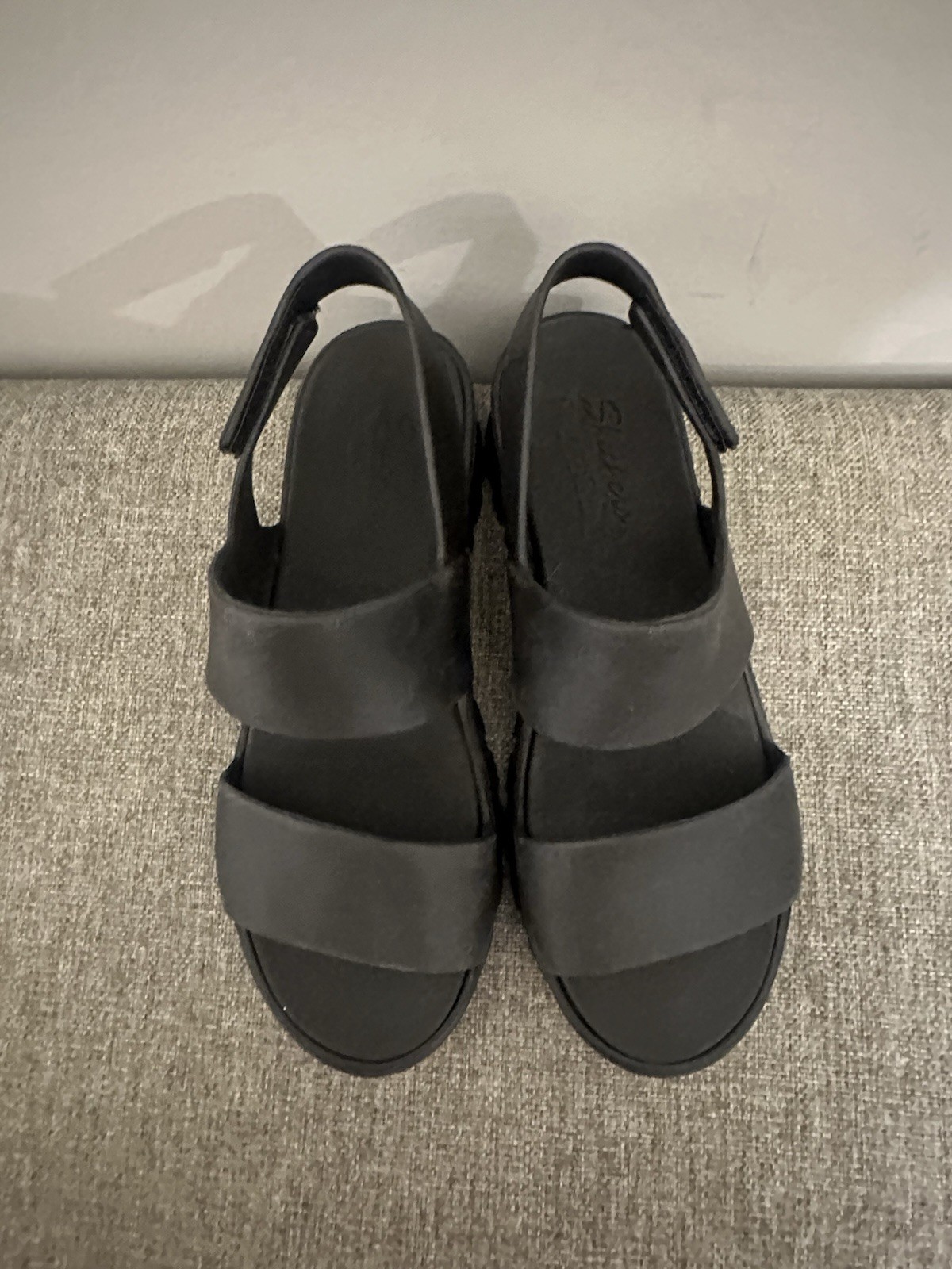 The Skechers Arch Fit Women's Black Strappy Wedge sandals in size 9 are a stylish and comfortable option for women looking for a low heel shoe. These sandals feature a solid black color with a hook and loop closure for easy wear. The wedge heel and strappy design provide both support and fashion, while the arch support and comfort features ensure all-day wearability. The Skechers brand is known for quality and durability, making these sandals a reliable choice for everyday wear. Preowned Good Condition