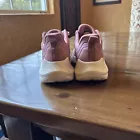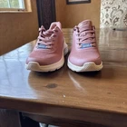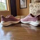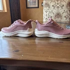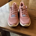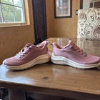 These Skechers BOBS Sport Squad Chaos slip-on sneakers for women feature a pink knit fabric with lace accents and a logo detail. They are comfortable, breathable, and suitable for activewear, casual wear, or workwear. The shoes have a low-top design with a solid pattern and a rubber cleat outsole. They are a vintage style with a sports theme, ideal for running, cross-training, or CrossFit activities.