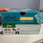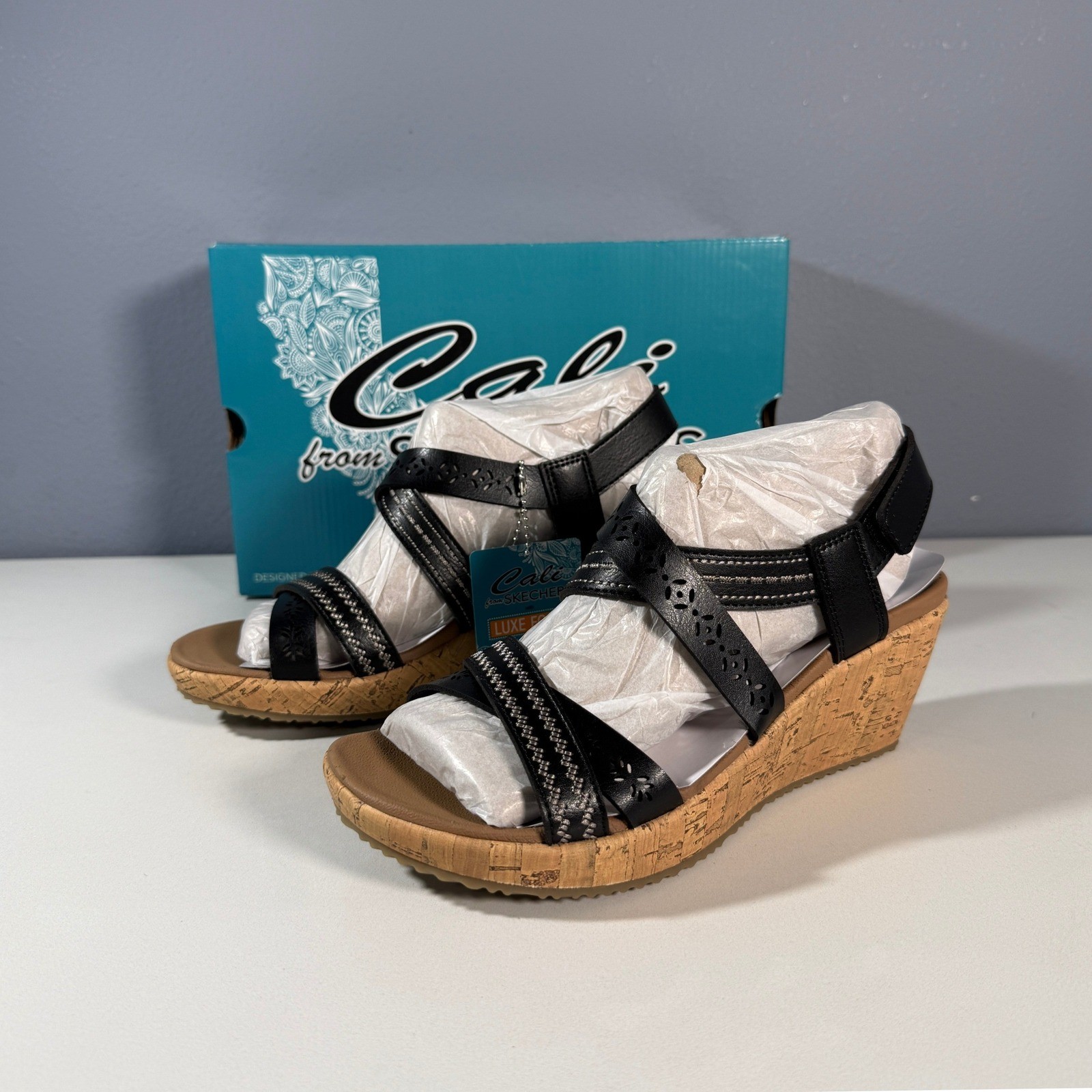 Skechers Cali wedge sandals in black with a vegan design. These stylish sandals feature crisscross straps with decorative stitching and cut-out details, a comfortable Luxe Foam footbed for all-day wear, and a cork-wrapped wedge heel. Adjustable ankle strap ensures a secure fit. Perfect for casual outings, vacations, or summer evenings. Size 7 New with Box Style: Strappy Department: Women Upper Material: Faux Leather Heel Style: Wedge Features: Ankle Strap, Padded, Comfort, Vegan, Straps Closure: Hook & Loop Pattern: Solid Accents: Logo, Embroidered Model: Cali Heel Height: High (3-3.9 in) Type: Sandal Keywords: Skechers Cali, wedge sandals, black sandals, vegan shoes, cork wedge, strappy sandals, summer shoes, comfortable sandals, casual wedges, women's footwear, ankle strap sandals, platform sandals