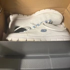 Skechers D'Lites Elite White Leather Sneakers, Women's Size 11. These classic white leather sneakers feature light blue and silver accented lace loops, offering a touch of modern style to a comfortable design. Perfect for everyday wear, light activity, or casual outings. Excellent pre-owned condition with minimal signs of wear.