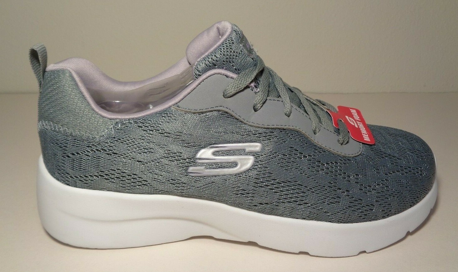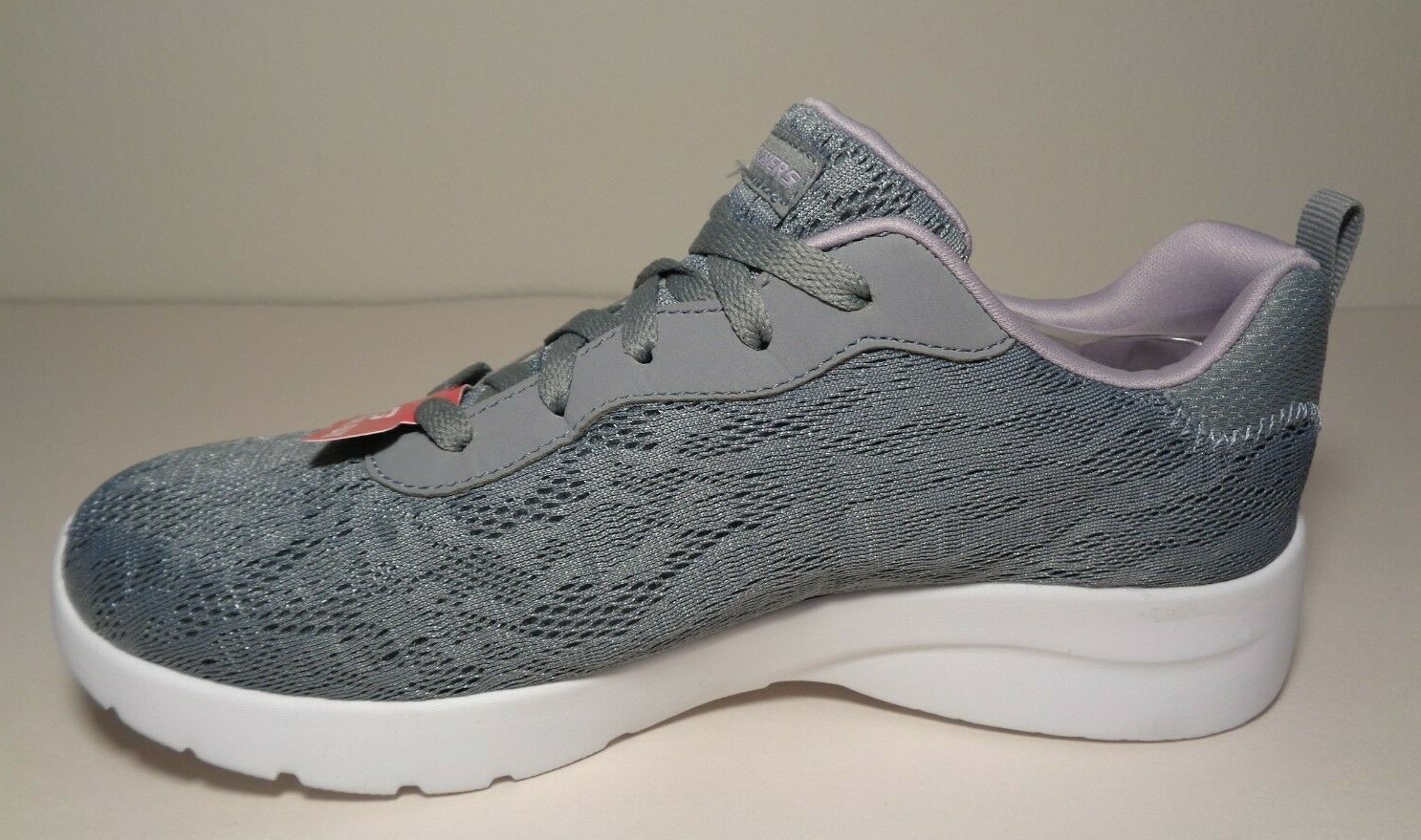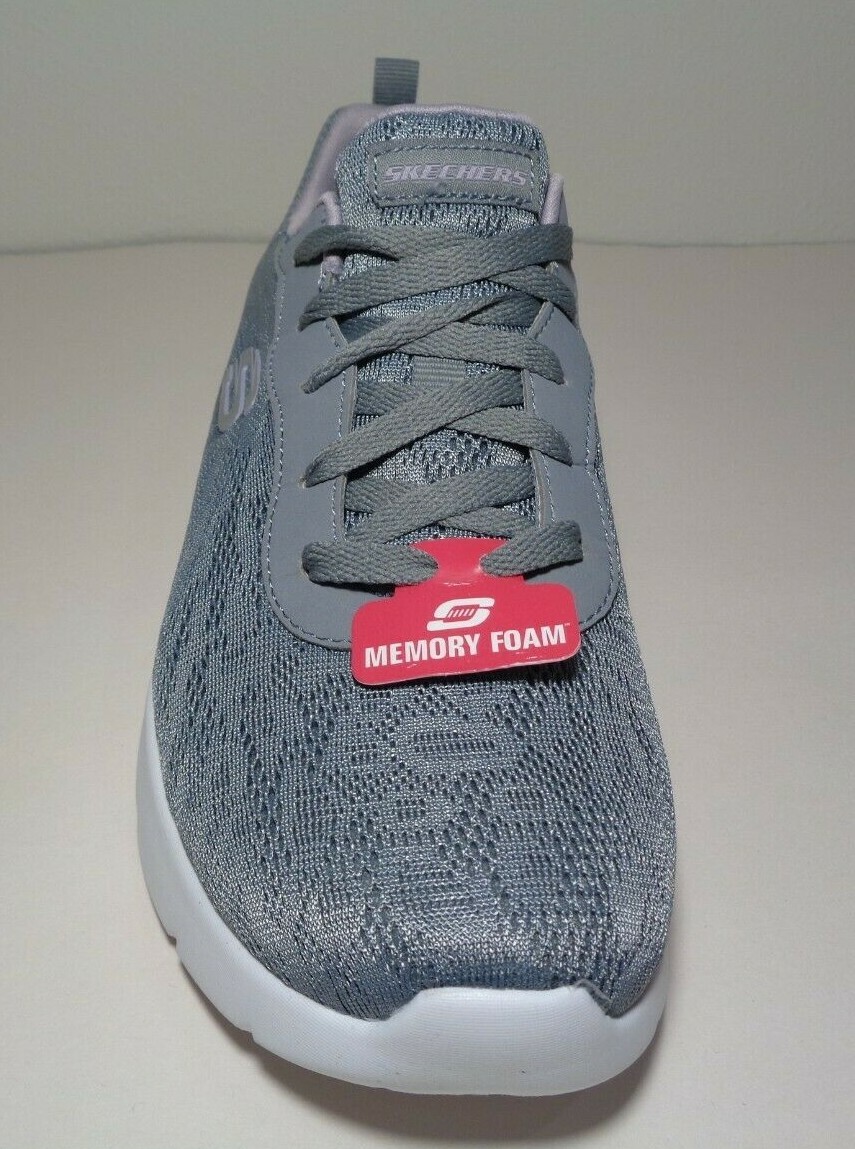 Skechers Size 7.5 M DYNAMIGHT HOMESPUN Grey Lavender Sneakers New Women's Shoes Style: DYNAMIGHT 2.0 HOMESPUN Color: Grey/Lavender Mesh fabric upper features woven-in floral pattern throughout Soft fabric lining Lightly padded tongue and collar for added comfort Memory Foam insole lends to long-lasting wear Smooth, contoured midsole with impact cushioning protection Flexible outsole with versatile traction design Lace-up construction for a secure fit Round toe with sturdy reinforcement Synthetic overlay at laces for added durability Rear pull-tab offers easy entry Signature logo accents at tongue, side, and heel panel Eur 37.5 UK 4.5 CM 24.5 BRA 36