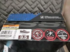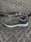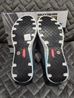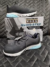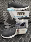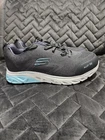 Women's Skechers Glide Step SR-Alloy Toe sneaker in size 9.5, featuring a Low Top shoe shaft style in Dark Gray Slate/Baby Blue color. This lightweight athletic shoe with a slip-resistant sole and safety toe is designed for extreme comfort and suitable for activewear, casual wear, or workwear. The shoe is accented with a Skechers symbol on the side and has a lace-up closure and breathable mesh upper with a memory foam insole.