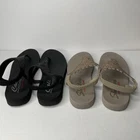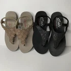 This product is a set of two Skechers sandals in black and rose gold, featuring a comfortable Yoga Foam insole. They are slip-on style slingback sandals with rhinestone accents and the Skechers logo. The sandals have a flat heel under 1 inch, making them suitable for casual wear, travel, and parties. They are lightweight, cushioned, and breathable, perfect for summer, fall, and spring seasons.