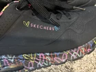 The Skechers Uno Loving size 8 is a stylish black lace-up sneaker featuring a heart design, perfect for women who love a combination of fashion and functionality. With its standard shoe width and synthetic upper material, this shoe is both comfortable and durable for walking activities. The Skechers brand is known for its quality athletic shoes, making this model a reliable choice for those looking for a cute and practical footwear option.