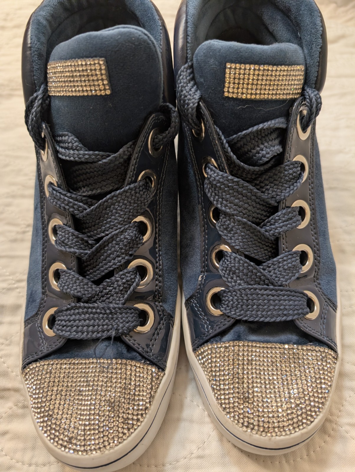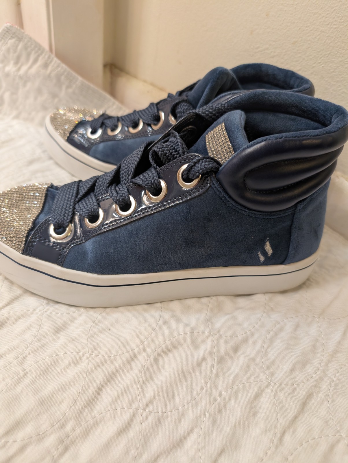 The Skechers Velvet Bling High Tops in size 7 are a stylish and comfortable choice for casual wear. These athletic sneakers feature a lace-up closure, solid blue color with velvet fabric lining, and memory foam features for added comfort. With a rubber outsole and Skechers branding, these shoes are perfect for walking and can be worn in various seasons such as summer, fall, and spring. Made in China in 2018, these high top sneakers are a fashionable and practical addition to any woman's wardrobe.