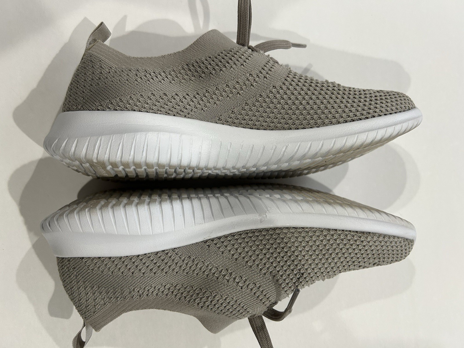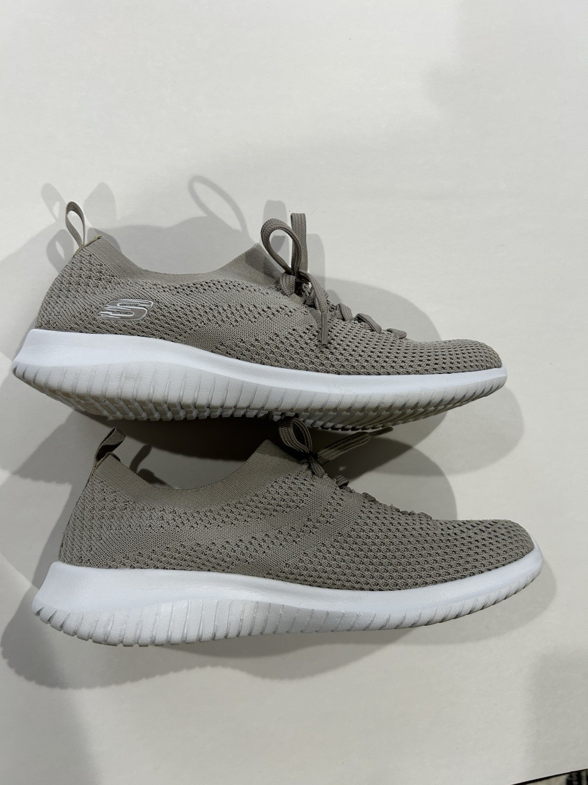 The Skechers Women's Size 7 Fit Ultra Flex Statement Taupe 12841W is a low top sneaker designed for casual wear. Featuring a solid beige color and a stretchy knit fabric upper, this shoe offers a comfortable and flexible fit. The rubber outsole provides durability and support for everyday activities, while the athleisure theme adds a touch of style to the classic design. Made by the well-known brand Skechers, this athletic shoe is perfect for women looking for a versatile and stylish option for their casual wardrobe.