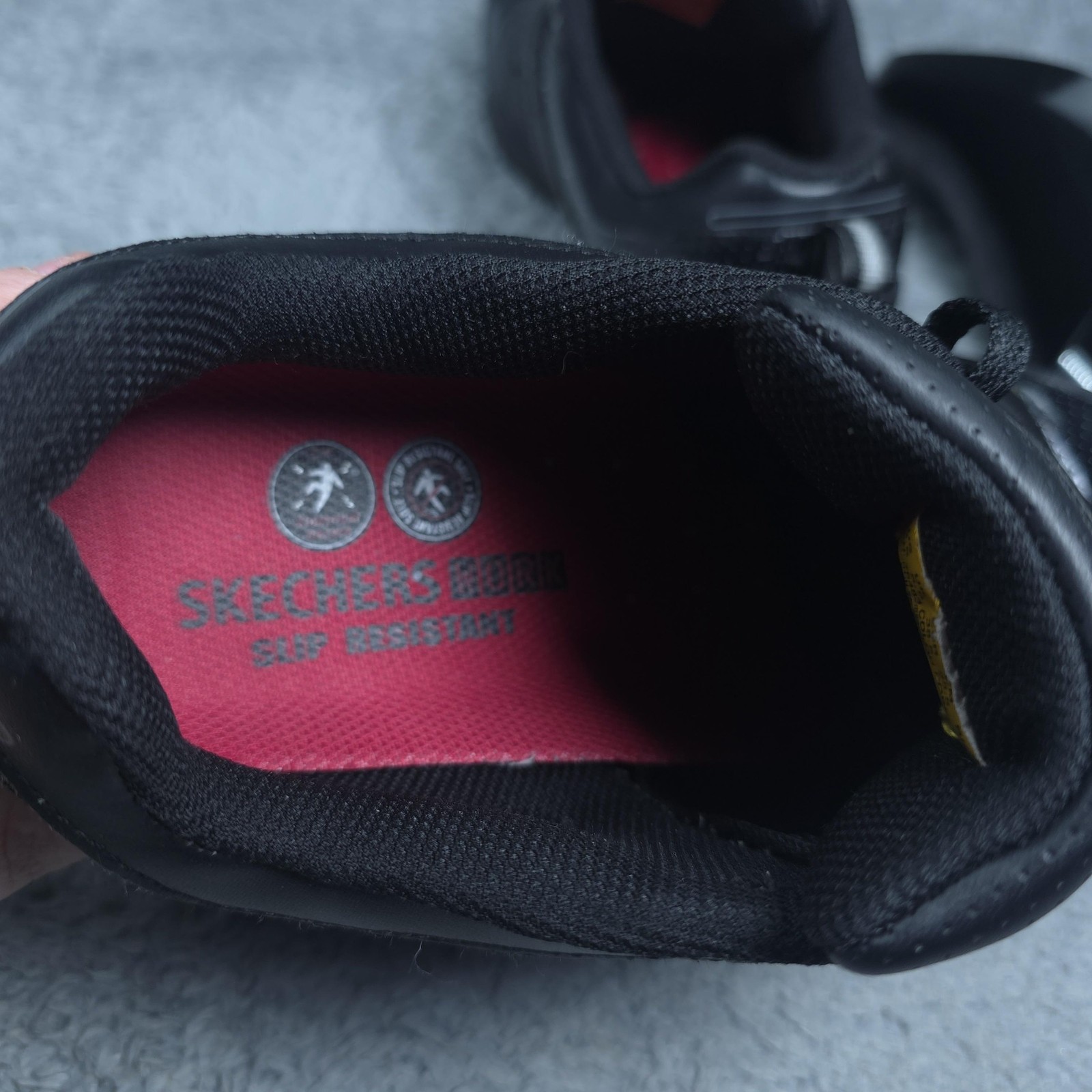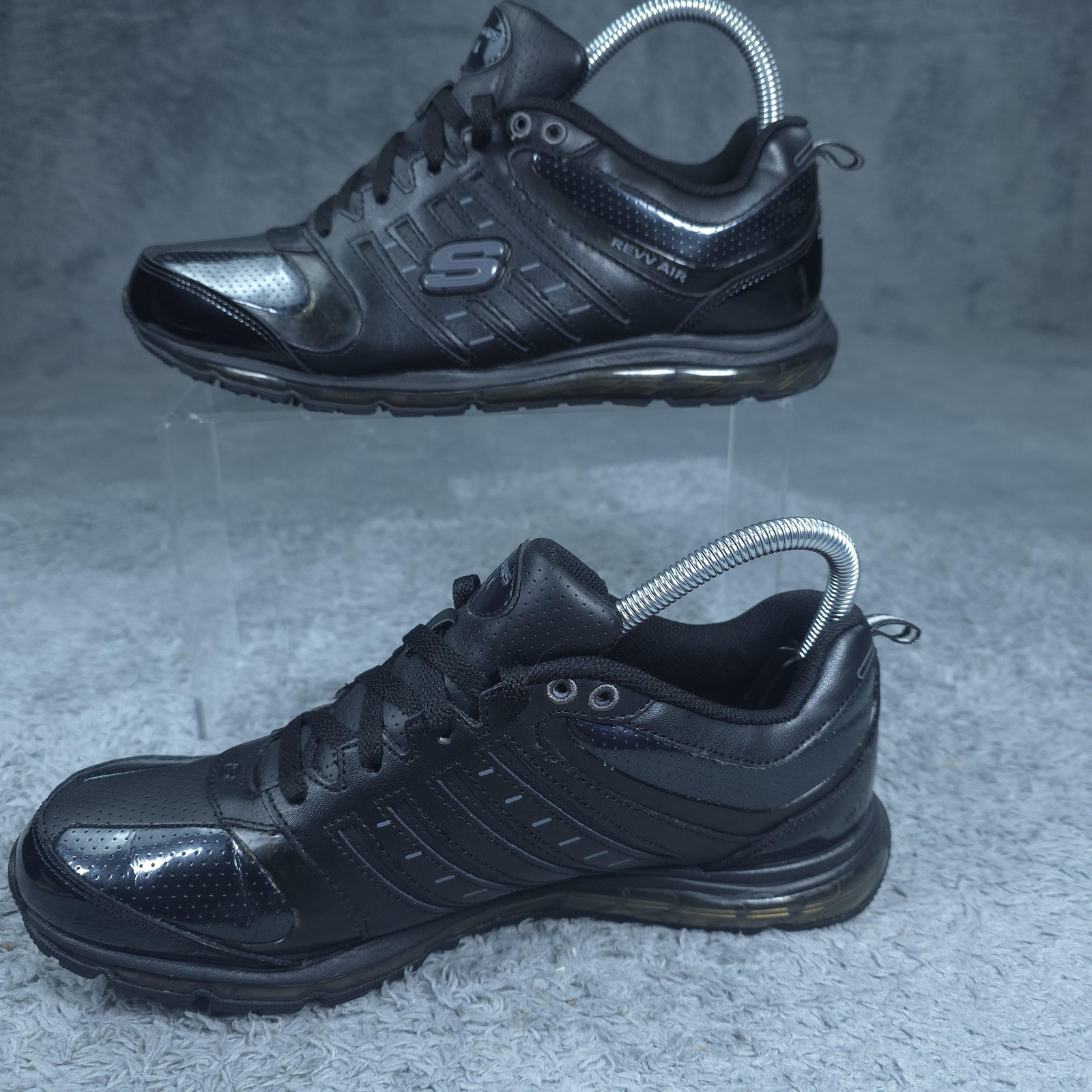 Brand: Skechers Model: Skechers Work Rev Air womens slip-resistant athletic sneakers designed for workplace and everyday wear. Style: Low-top lace-up work shoes with a leather and synthetic upper and visible air-cushioned midsole. Color: Solid black upper with glossy perforated toe overlays, black midsole, and black slip-resistant rubber outsole. Gender: Womens Size on tag: US 8.5, UK 5.5, EUR 38.5, CM 25.5, BRA 38. Upper material: Leather and synthetic upper with padded tongue and collar, textile lining, and cushioned insole for comfort. Features: Slip-resistant rubber outsole, Skechers REV AIR visible heel cushioning, lace-up closure, perforated panels for breathability, and low-profile athletic silhouette suitable for work or casual wear. Branding: Skechers Work logos on the tongue, heel, and outsole, "REV AIR" text on the lateral side, and Skechers slip-resistant icons printed on the insoles and embedded medallions in the outsoles. Outsole: Black slip-resistant rubber outsole with multi-directional tread pattern for traction on varied surfaces. Manufacturing details: Style number SN 76483 with color code BLK; leather/synthetic upper construction; made in China. Type: Skechers GOrun performance-inspired work shoes ideal for hospitality, retail, and other environments requiring reliable slip-resistant footwear. Item is in gently worn pre-owned condition. Item may contain normal signs of wear, blemishes, discoloration, creases and/or other signs of distress. Photos depict the exact item you will receive including measurements . Please refer to photos for full details prior to purchasing. If need be please measure against a similar clothing item you own. Items are cleaned in accordance with eBay's policies and standards and stored in a smoke free weather controlled environment. Fast USPS Shipping - 30 Day Free Returns - Hats Ship in a Box