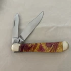 This unique skeleton pre-handed copperhead pocketknife is a must-have for any collector or outdoor enthusiast. The knife features a stunning yellow color with a bone handle and two stainless steel blades. The opening mechanism is manual, making it easy to use with both hands. This modern folding knife was manufactured in the United States in 2021 and is designed with ambidextrous dexterity. The knife's plain edge blade is perfect for everyday use, and the knife comes with a sheath for easy storage and transport. The Skeleton Pink pre-handed copperhead case knife is a great addition to any collection and is sure to impress.