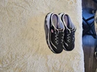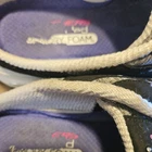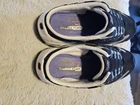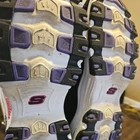 These are women's Skechers sneakers in black, featuring a slip-on style with a low top design. They have a solid pattern with rubber cleats and the Skechers logo as an accent. The shoes are size 10 with memory foam insoles, suitable for walking activities during the summer, fall, and spring seasons. The standard width shoes also include foam insoles for added comfort.