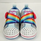 Super cute, sketcher, twinkle, toe girl, shoes size 6. Adorned with silver sparkles, stars above and velcro rainbow strap. Rhinestones on the toe light up with each step. New without box. Measurements: 6 1/8” length Shipping is calculated by eBay based on weight and size of package, which sometimes seems high, even to the seller. Therefore, seller shipping discount is shared with the buyer making it as low as possible. We use recycled shipping supplies, when possible. Due to new USPS policies, your item may take longer than USPS/eBay promises. Orders will be processed within stated time by seller. Security measures are taken to protect seller from fraudulent activity.