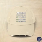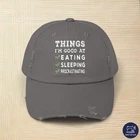 The funny design with the title Things I'm good at eating sleeping procrastinating. Go through life with a lot of humor, fun and happiness with this cool sarcastic, irony, self mockery motif. For friends and family to laugh together. PRODUCT DESCRIPTION Made with 100% cotton twill for high-end comfort and durability, these custom distressed hats bring all the style and practicality one needs in daily life. The low profile along with the D-ring closure on a self-fabric hideaway strap ensures both proper protection from the sun and that perfect, adjustable fit. .: 100% cotton twill .: Sewn-in label .: Closure: self-fabric hideaway strap with metal D-ring slider .: Printed using Direct to Film (DTF) technology .: Please note: Due to a special finishing process, distress and color may vary SIZE GUIDE Imperial One size Crown height, in 6.50 Width of front panel, in 7.37 Bill length, in 2.87 Metric One size Crown height, in 16.51 Width of front panel, in 18.73 Bill length, in 7.30