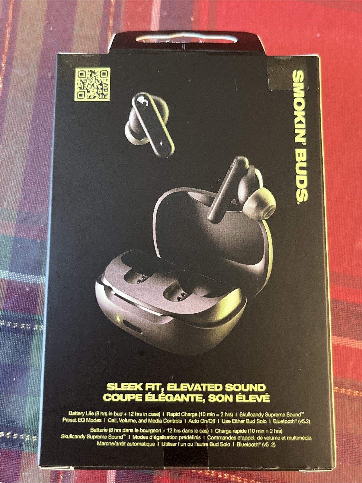 The Skullcandy Smokin' Buds True Black earbuds are a stylish and functional choice for music lovers on the go. With a double earpiece design and wireless Bluetooth connectivity, these earbuds offer convenience and ease of use. The active noise cancellation feature ensures a high-quality audio experience, while the water-resistant design and volume control make them practical for everyday use. The sleek black color and Skullcandy branding add a trendy touch to these reliable and durable earbuds.