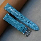 DESCRIPTION Condition: New 100% Color : Sky Blue with White Stitching Surface material: Stingray skin Species : Potamotrygon scobina Inside material: Genuine Epsom leather Size: Lug/Buckle width: 24mm/22mm, 22mm/20mm, 21mm/18mm, 20mm/18mm, 19mm/16mm, 18mm/16mm, 16mm/14mm (For another size please contact us) ex: 21/19mm or 20/20mm.... Long strap length: 125mm - Short strap length: 75mm
