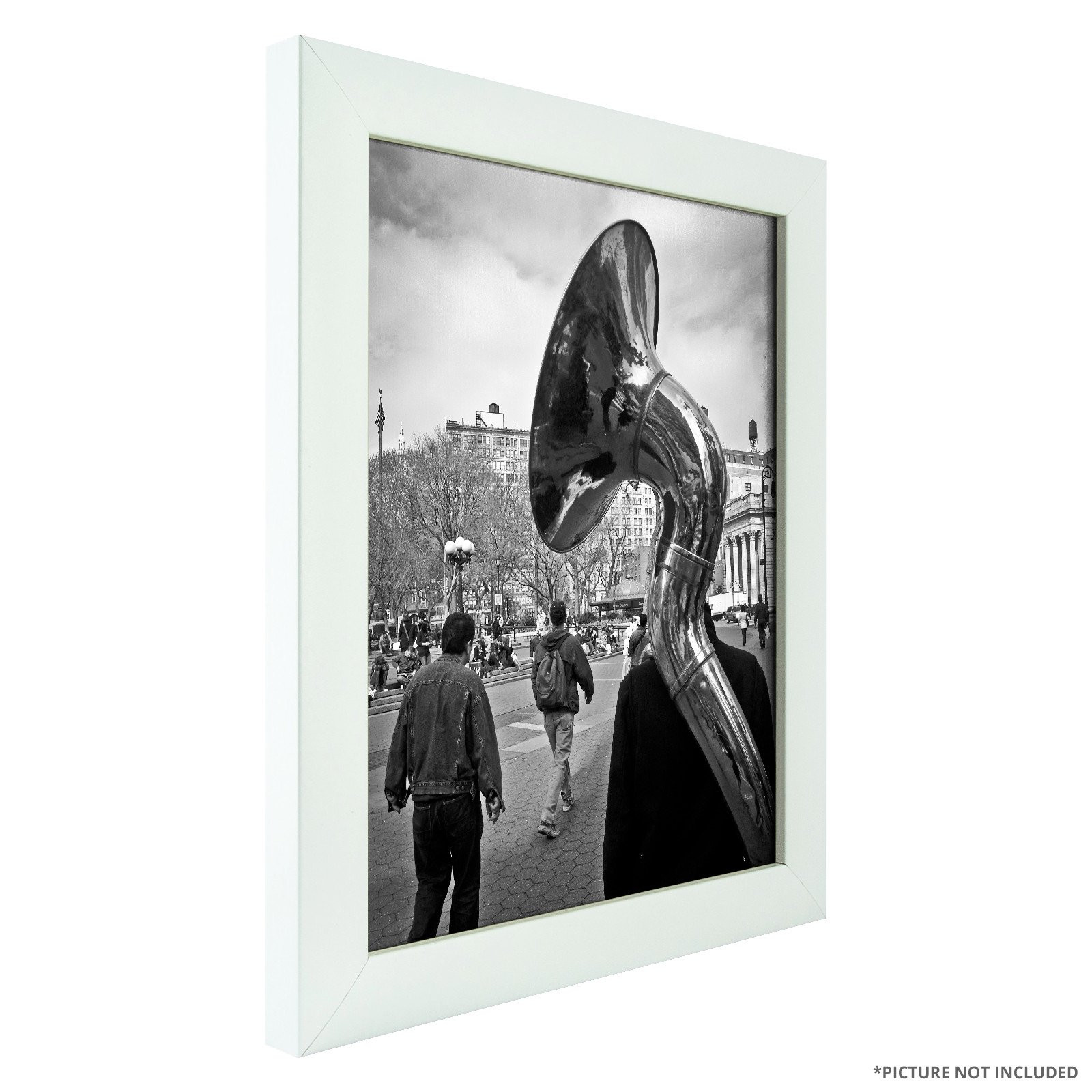 Our most popular, versatile and cost effective picture frame series has become a staple for many of our customers. The contemporary profile is square with a slightly convex surface. This moulding features an MDF core with a smooth White Satin laminate wrap. The character of this contemporary frame maintains a style of prominent simplicity. Contemporary style; white; smooth wrap finish Frame includes: glass, rigid black backing and pre-attached stamped hanging hardware Frame holds a 4 inch by 6 inch photo/print (viewable area reduced by .25" on each side due to frame lip) Frame moulding is 1 inch wide; MDF wood composite Frame is designed for WALL HANGING only (hanging hardware allows for portrait or landscape orientation)
