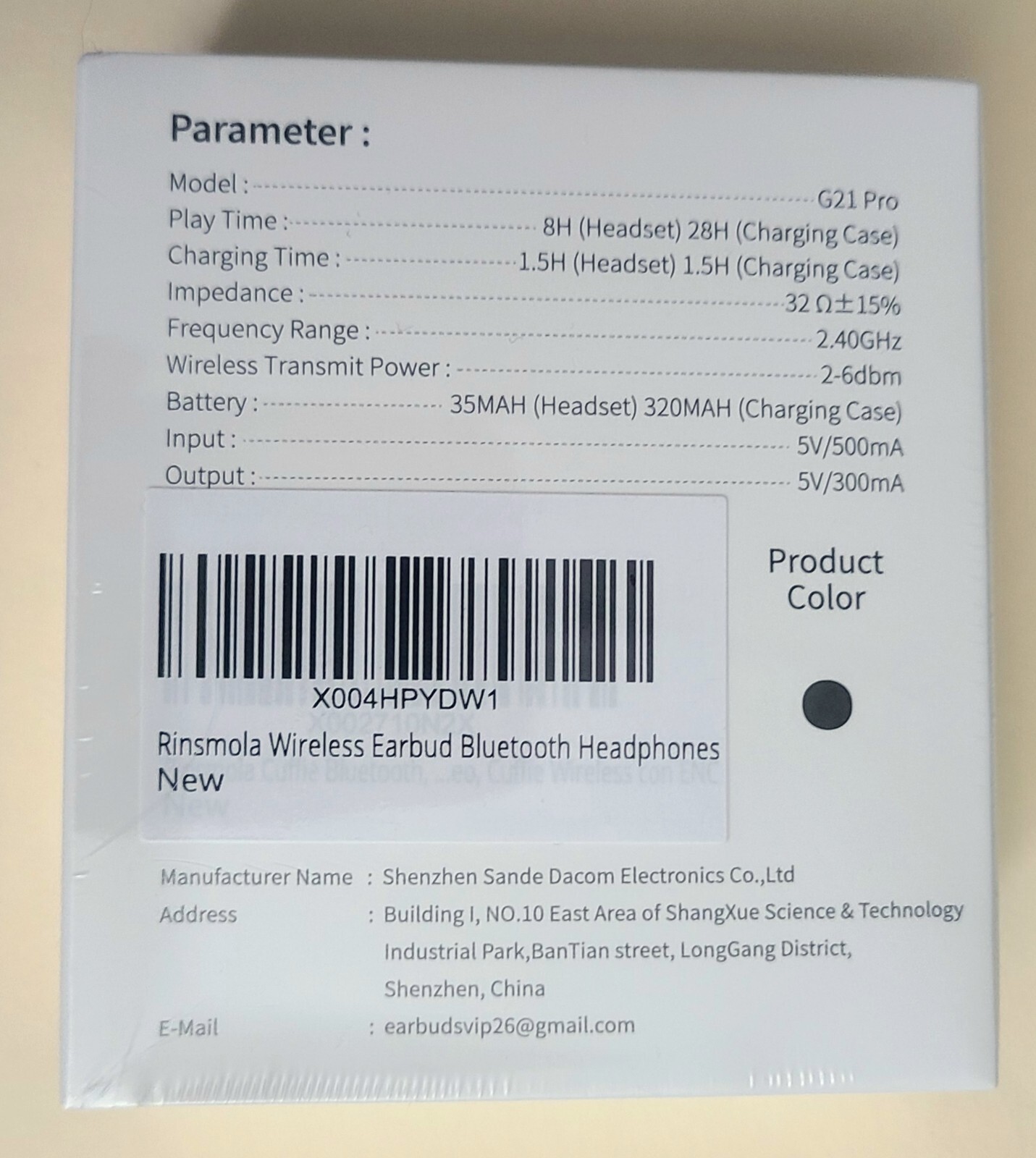 Rinsmola G21 Pro True Wireless Earbuds - Black. Hi-Fi stereo earbuds. Ultralight & ergonomic. Waterproof, 4 ENC noise canceling, dual LED display, for Android/iOS USB-C. Fast charging 1.5 hours. Bluetooth 5.4 - 1 second connection. Silicone ear tips in 3 sizes.