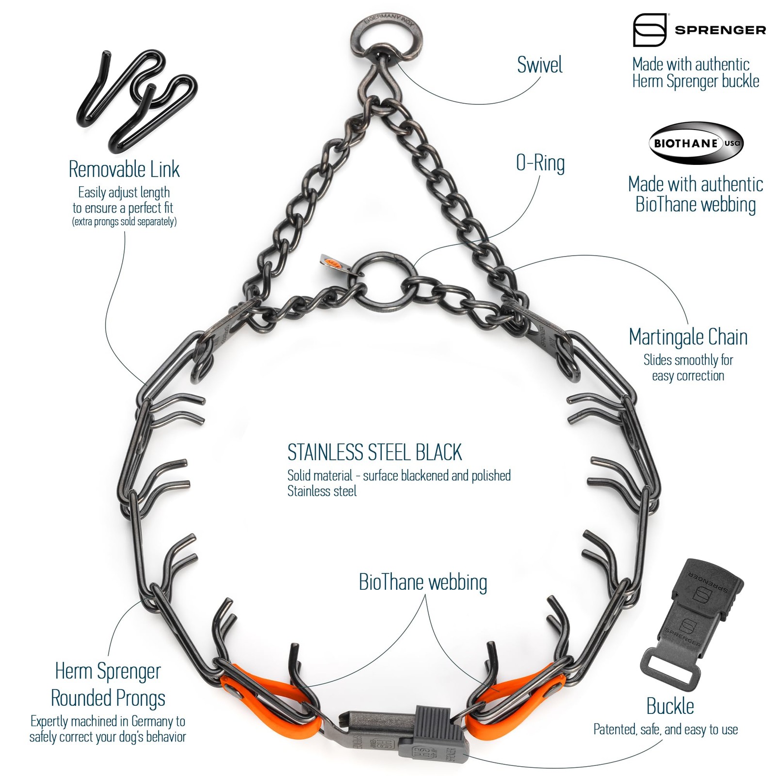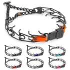 Black Stainless Steel Prong Collar: This training prong dog collar features a Click Lock Buckle, Swivel D-Ring and U.S. made Biothane insert; The Biothane insert enhances the stability and security of the buckle connection with the prongs, while adding a personalized touch with a choice of different colors Important Size Guide: To select correct collar size, you must refer to the indicated Neck Sizes and not the overall length of the collar; If needed, adjust collar length by removing or adding pronged links to the desired length Black Stainless Steel Prong Collar: This training prong dog collar features a Click Lock Buckle, Swivel D-Ring and U.S. made Biothane insert; The Biothane insert enhances the stability and security of the buckle connection with the prongs, while adding a personalized touch with a choice of different colors Use and Functionality: ClickLock buckle allows placement and removal of the collar without pulling it over the dog’s head; NOTE: Plastic Black Jacket is designed to SLIDE ON AND OFF the unfastened buckle and does not compromise functionality of the enclosure; Swivel D-Ring is designed with full 360-degree rotation, allowing for no tangle full mobility of the leash Training and Performance: Premium quality training collar works optimally for communicating with your dog; Assembly chain loop tightens if the dog is pulling on the leash, which provides additional help for training and behavior correction; The collar must be worn snugly under the dog’s ears and jawline for best results and safety Made in Germany: The prong collar is made with precise German engineering, reliability, and quality by – the manufacturer of top-quality training collars; Assembled and enhanced with Biothane in the U.S.A.; For warranty and questions about the product, contact the seller via your ORDERS page; Do NOT contact