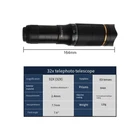 Sleek Design 32X Zoom Telephoto Lens Compatible with Most For Smartphones DESCRIPTION Features: *Powerful Zoom Capability: The 32X Telephoto Lens enables users to capture distant subjects with incredible detail, making it perfect for wildlife photography, sporting events, or any situation where you need to for get closer without physically moving. *Versatile Compatibility: This telephoto lens is designed to work seamlessly with a wide range of smartphones, including for ANDROID and for IPHONE models, that most users can enhance their photography experience effortlessly. *Sturdy Tripod Included: The package comes with a reliable tripod, providing stability and minimizing camera shake during use. This feature is essential for achieving clear and focused images, especially in low-light conditions. *Easy Setup with Phone Clip: The lens includes a convenient phone clip that allows for quick and secure attachment to your device. This ensures a hassle-free setup, enabling you to start in no time. *Compact and Lightweight Design: Constructed from ABS material, the lens is lightweight and portable, making it easy to carry on outdoor adventures or during travel, without adding significant bulk to your gear. Specifications: Part Name:Mobile telescope 32X telephoto doubled Material:ABS Size:23*12.5*6.5CM Color:Black Package Content: 32x lens*1 1*mobile phone clip 1*eye mask 1*tripod 1*E-type clip 1*storage bag 3*lenses Note: 1. The real color of the item may be slightly different from the pictures shown on website caused by many factors such as brightness of your monitor and light brightness. 2. Please allow slight manual measurement deviation for the data. POLICES Shipping Payment WARRANTY We only ship to confirmed ebay Order addresses. Please comfirm that your Order address is in line with your shipping address. Please kindly note that the c ombined shipping is not provided because the shipping fee is calculated by weight. Also, the each additional item means exactly the the same color and size. It takes about 7 -15 working days to US; about 10-30 working days to other countries. Transit time may be a little delayed because of the bad weather and customs inspection . If you do not receive your item within 30 working days since payment finished, please contact us immediately for further assistance. Payment must be completed within 5 days. If you have any problems about payment, please contact us via ebay message. We strive for 100% customer satisfaction! Positive Feedback is very important to us. If you have any questions, p lease feel free to contact us via "Ask seller a question" . We will reply your email within 24 working hours.