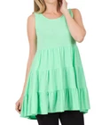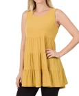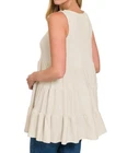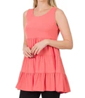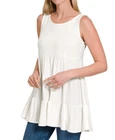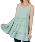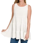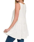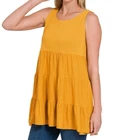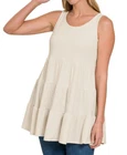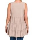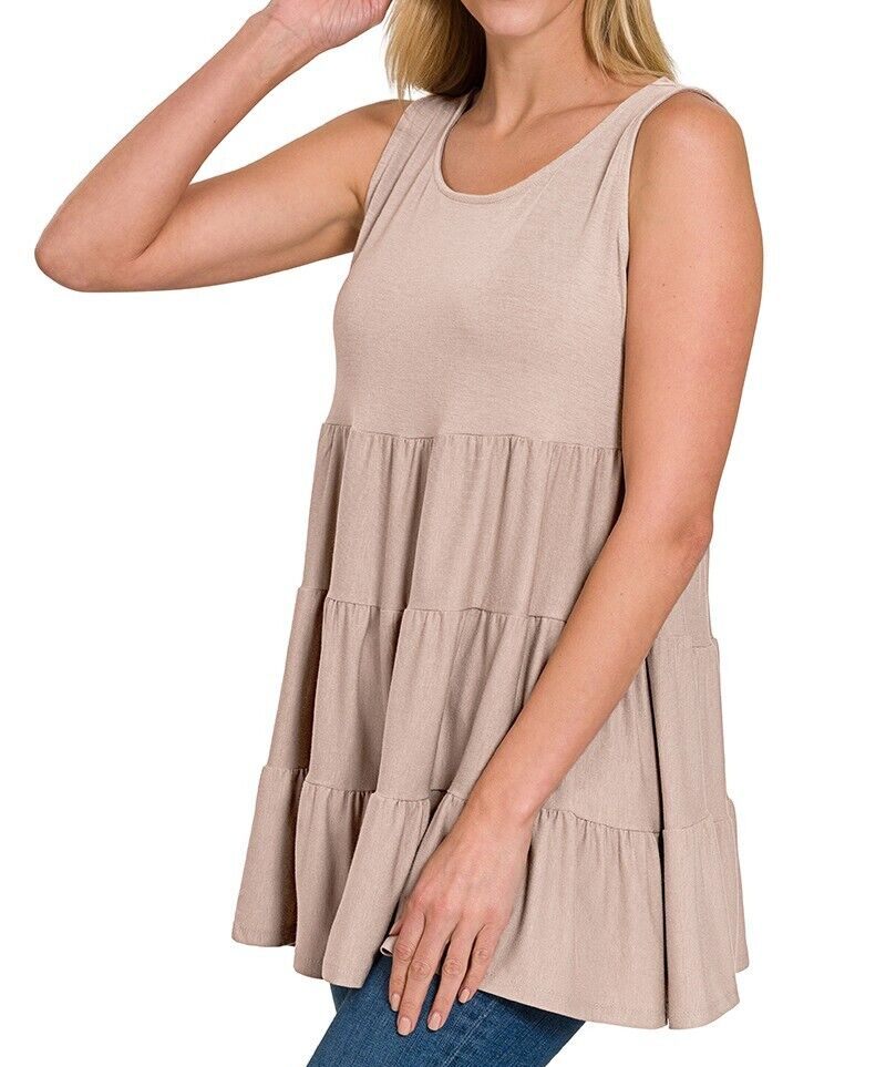 Round Neck Sleeveless Baby Doll Top or Tiered Ruffle Tunic For accurate fit, lay a t-shirt flat and compare the measurements with the size chart below (measured flat with no stretching): Size Bust Total Body Length Small Approx. 34-36" 28.5" Medium Approx. 36-38" 28.5" Large Approx. 38-40" 28.5" X-Large Approx. 40-42" 28.5 Product Detail Sizes: Small, Medium, Large, X-Large Material: 57% Polyester, Rayon 38%, 5% Spandex Soft Stretchy Poly Rayon Blend Fabric Machine Washable