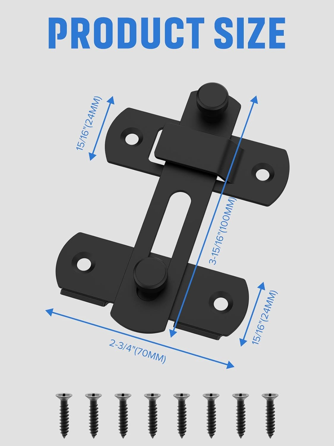 Store New Arrivals Add to Favorite View Feedback Sliding Barn Door Lock, Stainless Steel Safety Flip Gate Latches & Door Bolt Locks for Wine Cabinet, Bathroom, Outdoor, Garage, Garden, Closet (1, Black) Description Item model number DL-01 Part Number DL-01 Batteries Required? No Item Package Quantity 1 Color Black Product Dimensions 4.33 x 1.96 x 1.18 inches Item Weight 2.82 ounces Batteries Included? No Color Name Black Manufacturer MeBantoo Reliable Material: 180° barn door lock is is made of stainless steel and has a multi-layer polished surface to eliminate any corrosion, rust and discoloration, ensuring durability and reliability. This matte black barn sliding door lock is smooth and does not hurt your hands Can be Mounted at Various Angles: Unlike ordinary barn door locks and latches, our locking barn door latch is not limited by the space between the door and the wall, whether it is a flat angle or a right angle, it can be installed and worked, lock the sliding door firmly, and toggle the latch, the lock can be 360° rotated , and you can mount the door hook lock on the left and right sides Easy Installation: 180 degree right angle door latch buckle comes with mounting screws for attachment to wood or other flat surfaces, it's very easy to install, you just need to use a screwdriver to screw the 4 mounting screws to fix it. But you need to pay attention to the distance of the rotation card, if the distance is wrong, it will not work properly Wide Application: The barn sliding door locks are ideal for most door and cabinets, bedrooms, toilets, doors, garages, gardens, bathrooms, cabinets, kitchens, offices, hotels, window, pet locks. to save space and organize space, designed for all wooden doors Safety and Privacy: Don't worry about children or adults breaking in accidentally,affecting the privacy space you need.The barn door lock specially designed for right angle doors ensures your privacy Sliding Barn Door Lock, Stainless Steel Gate Latches Flip Latch Safety Door Bolt Latch Lock for Wine Cabinet, Bathroom, Outdoor, Garage, Garden, Closet Door ABOUT US We offer the best prices around on high quality products. Our E-store includes media such as books, movies, music and games while offering electronics, toys, sporting apparel, clothing, tools, general home, garden items and more. SHIPPING We are always working hard to ensure your package arrives as soon as possible. Please understand that some factors like weather, high postal traffic, and the performance of shipping companies are outside of our control. We offer free shipping to the lower 48 states and ship within 2 business days of payment, usually sooner. We do not accept P.O. Boxes. Please provide a physical address. RETURNS We offer a 30-Day Return Policy on items which you are not completely satisfied with. You have the option for a full-refund or an exchange of the item. No returns are available on items shipped outside of the USA. PAYMENT We accept PayPal. CONTACT US This page content is yet to come Please ad us to your favorite seller and visit again later Thank You